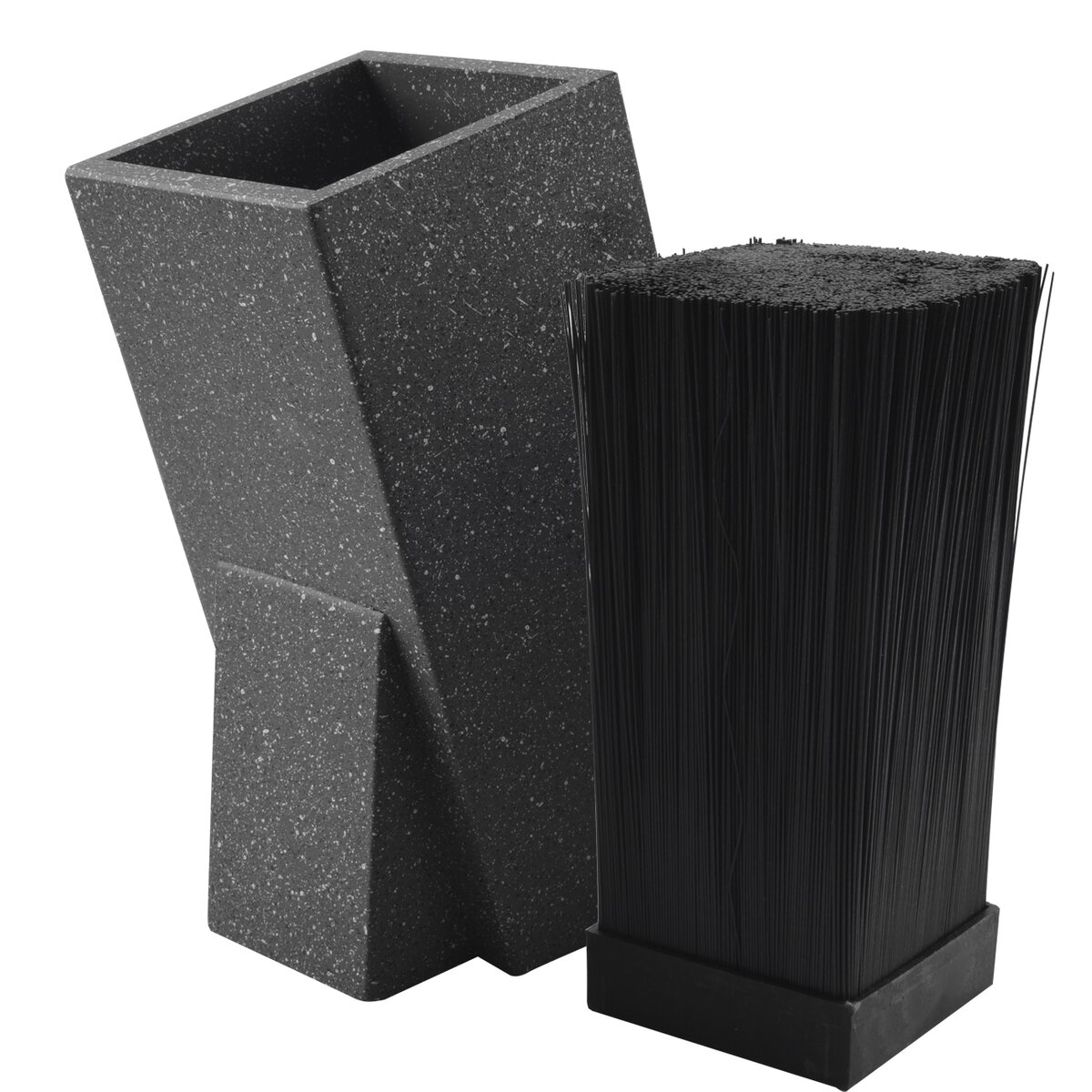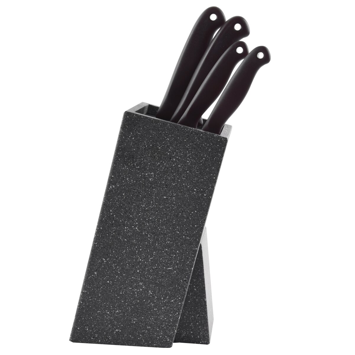 Kód produktu 540555Hranatý drevený stojan na nože s povrchom imitujúcim mramor a s plastovými štetinami na uloženie kuchynských nožov aj nožníc.