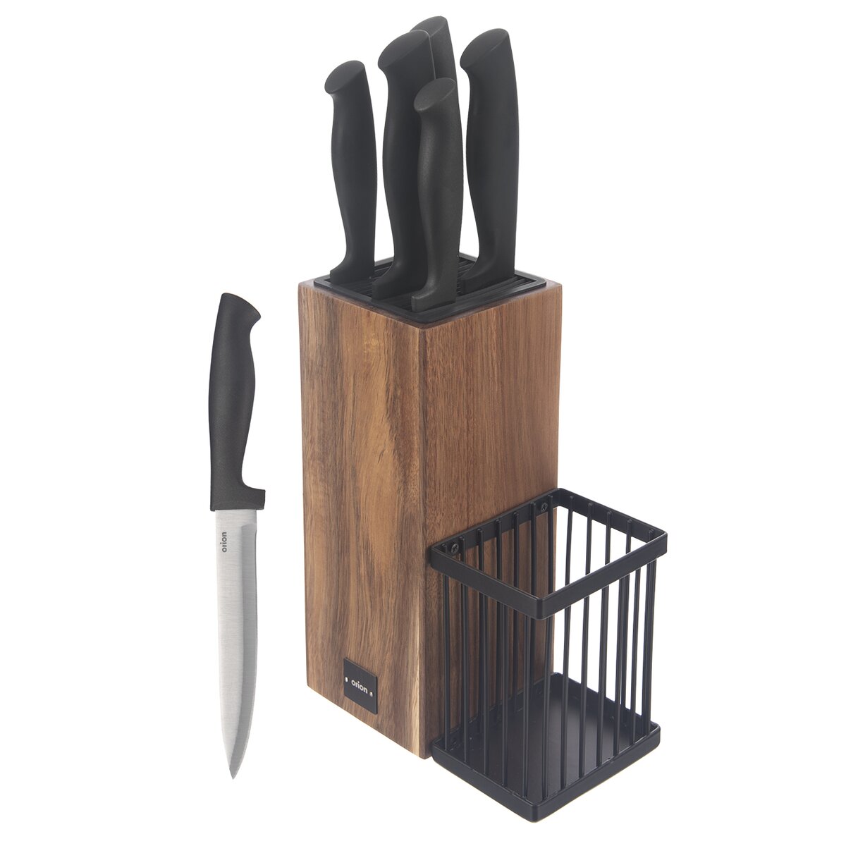 Kód produktu 122999Sada 5 kusov kuchynských nožov s nerezovou čepeľou, uložených v akáciovom stojane s vkladom so štrbinami. Stojan je doplnený kovovým postranným košíkom, vhodným na uloženie rôzneho kuchynského náčinia.