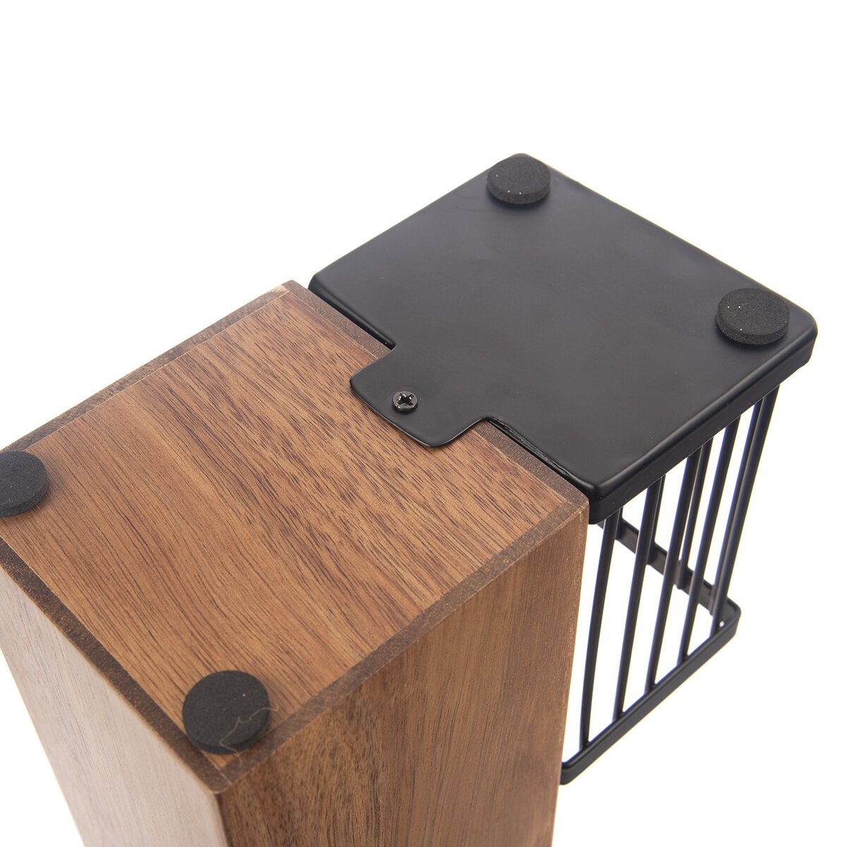 Viac informáciíZaujímavý stojan z akáciového dreva je doplnený plastovým vkladom, do ktorého pozdĺžnych štrbín je možné zasunúť nože rôznych veľkostí. Súčasťou sady sú kuchynské nože s nerezovou čepeľou a čiernou plastovou rukoväťou, ktoré slúžia na krájanie, porciovanie, čistenie mäsa, ovocia, zeleniny, na krájanie byliniek.