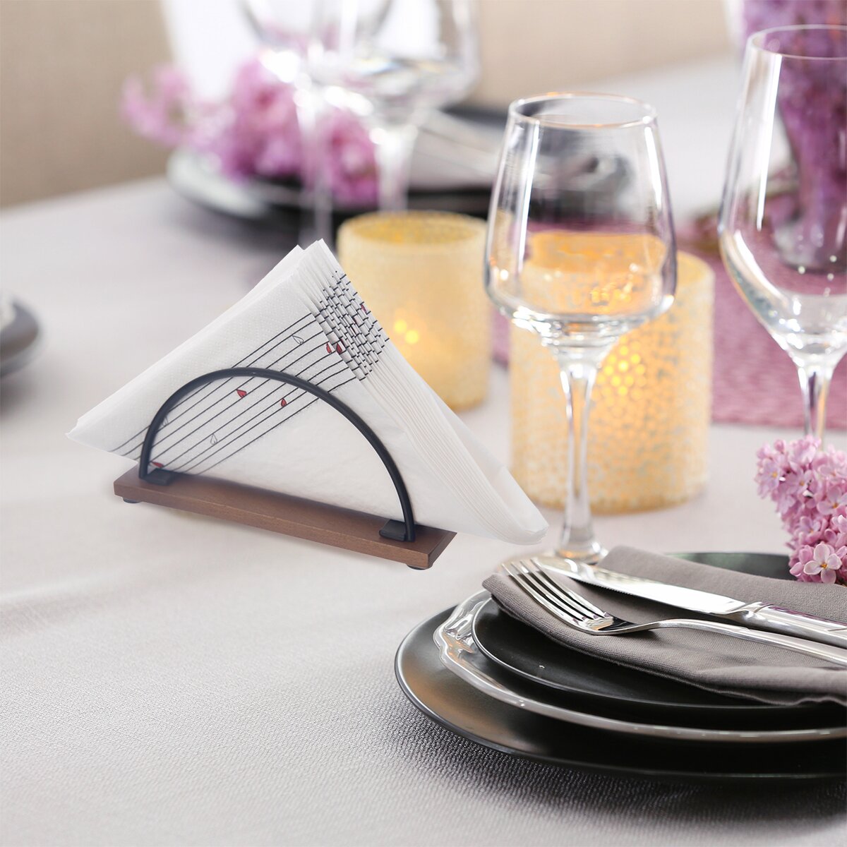 Kód produktu 154319Drôtený stojan na obrúsky z kovu a akáciového dreva umožní jednoduché uloženie obrúskov pri každodennom aj sviatočnom stolovaní.