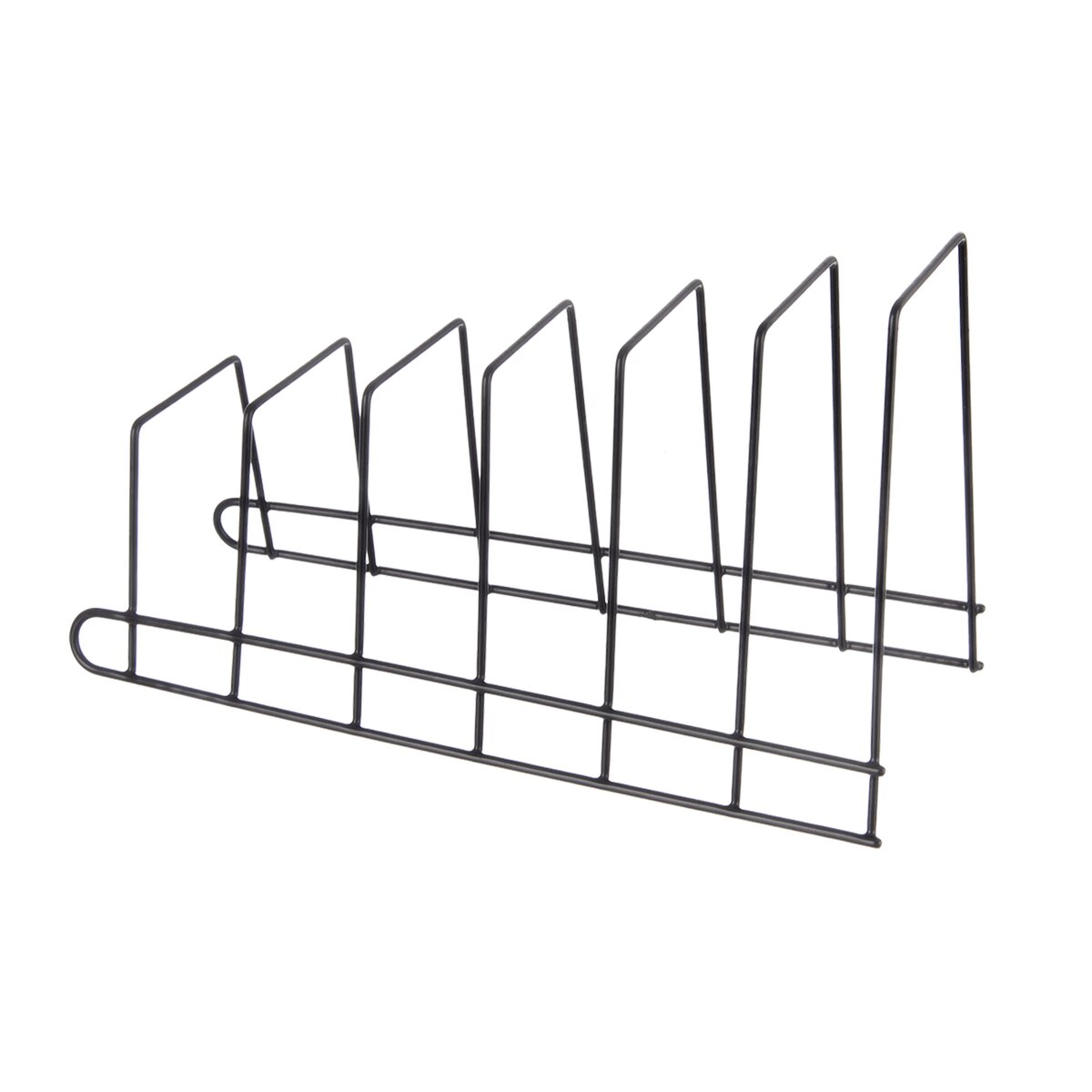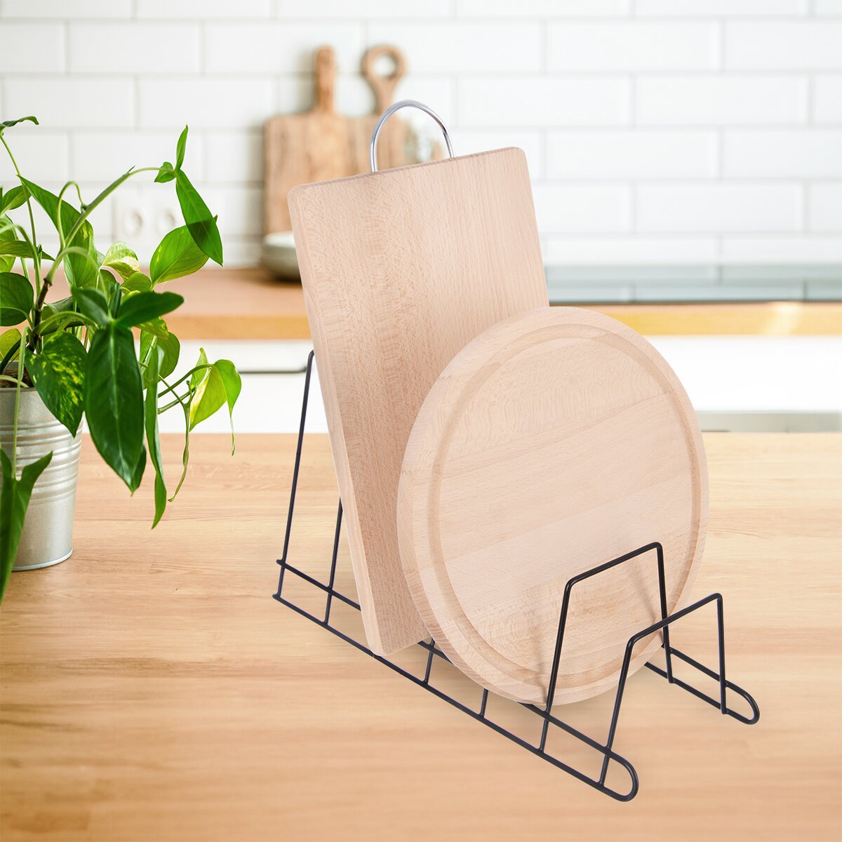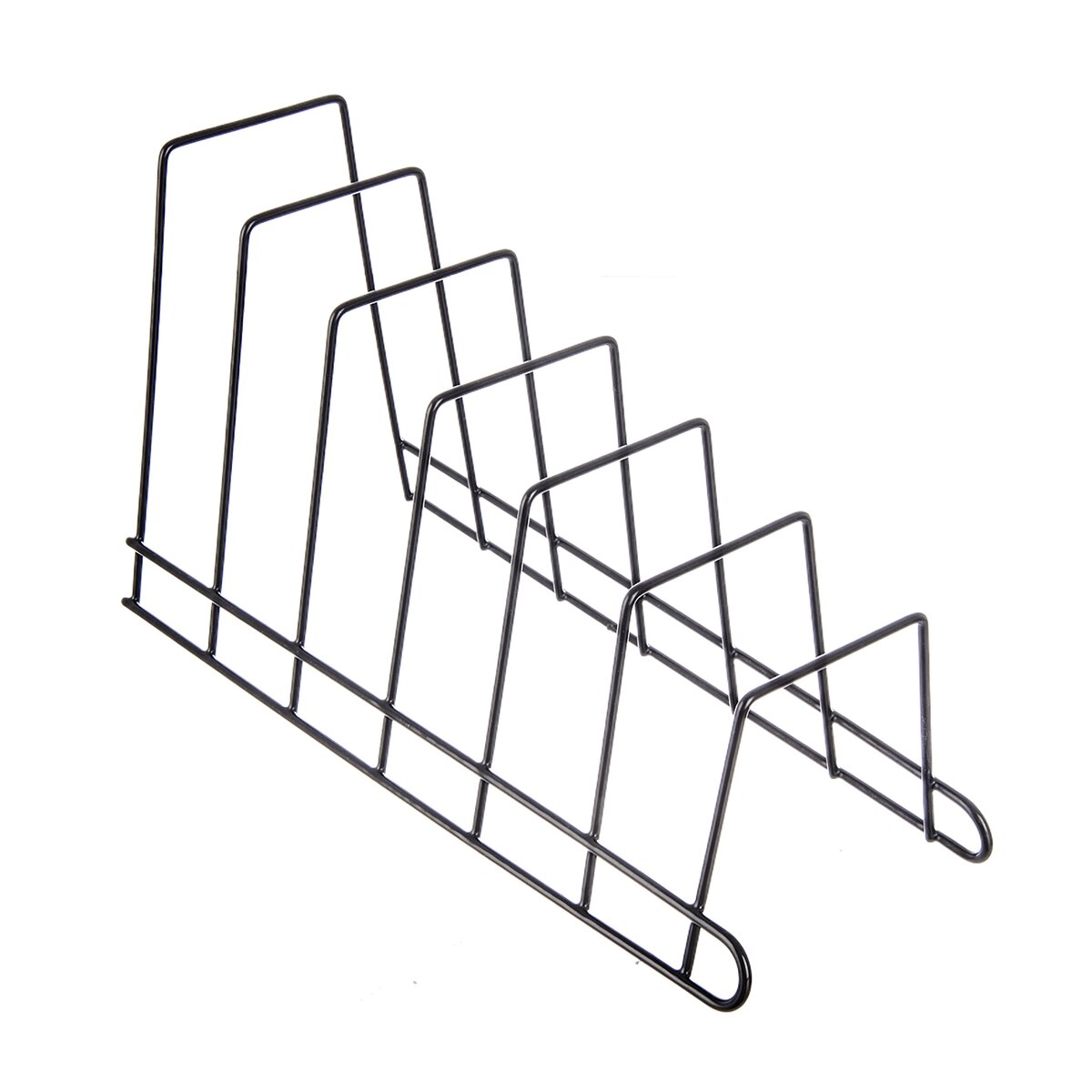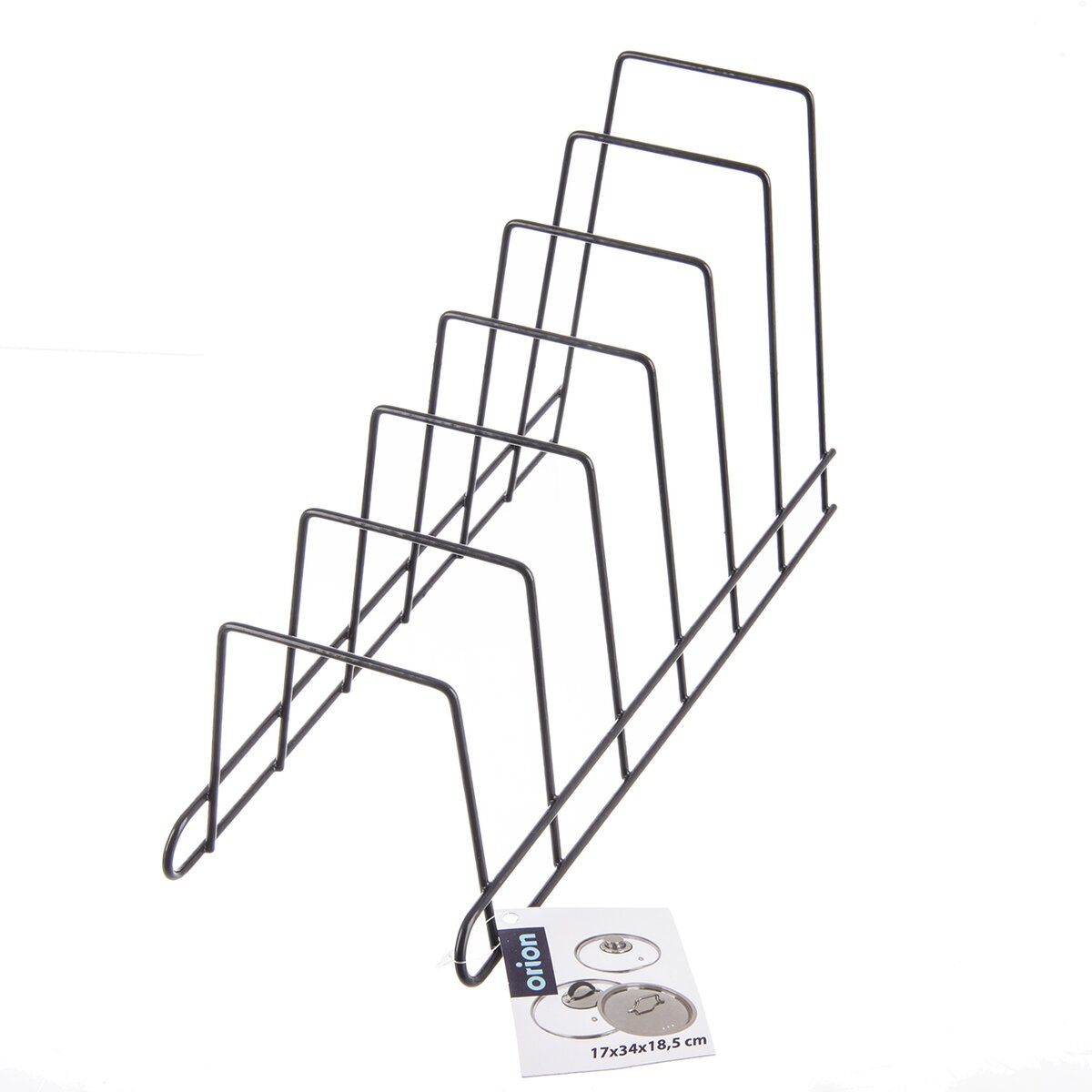 Praktický drôtený stojan s plastovou povrchovou úpravou zaistí bezpečné aj prehľadné uloženie až 6 kusov nerezových, smaltovaných alebo sklenených pokrievok. Prípadne ho možno využiť na usporiadanie dosiek na krájanie alebo podložiek pod hrnce.