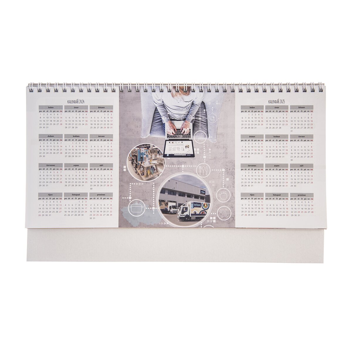 Kód produktu 834654Týždenný stolný kalendár Orion na rok 2024 (český) vrátane kartónového stojanu. 60 strán, farebný, krúžková väzba. Materiál: papier, kov. Rozmery: 31,5x19x10 cm.