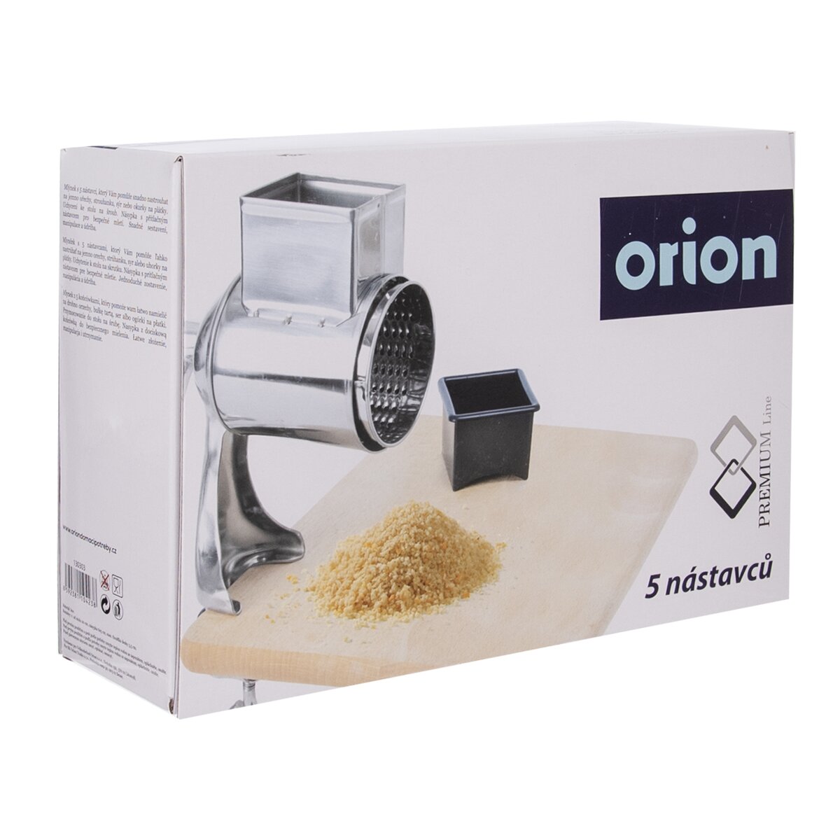 Viac informáciíMlynček s 5 nástavcami, ktorý pomôže ľahko nastrúhať na jemno strúhanku, piškóty, orechy, mandle, tvrdý perník, syr alebo uhorky na plátky. Má nerezové telo s nástavcami, mlecí mechanizmus je poháňaný ručne pomocou plastovej kľučky.