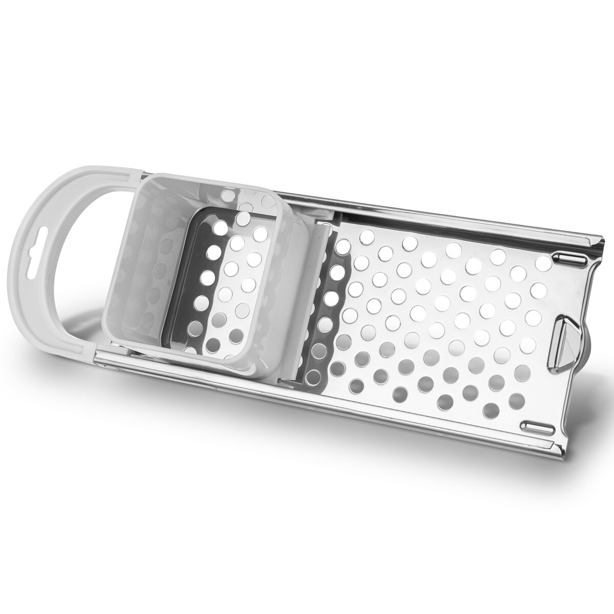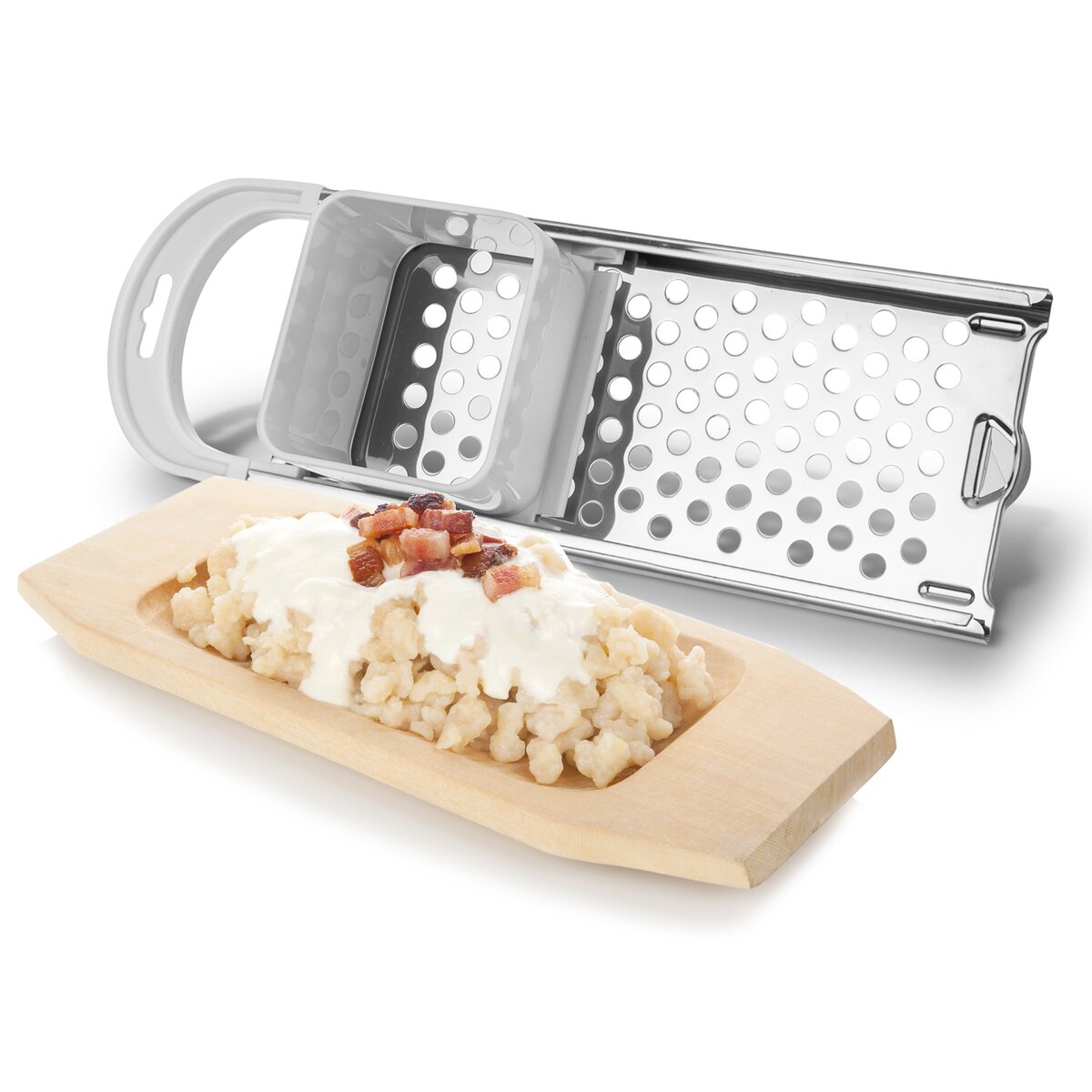 Kód produktu 120752Pevné plastové strúhadlo s nerezovou doskou s guľatými otvormi a v drážke sa pohybujúcim nástavcom, pre jednoduchú prípravu halušiek, pečeňových knedličiek, polievkových závariek.