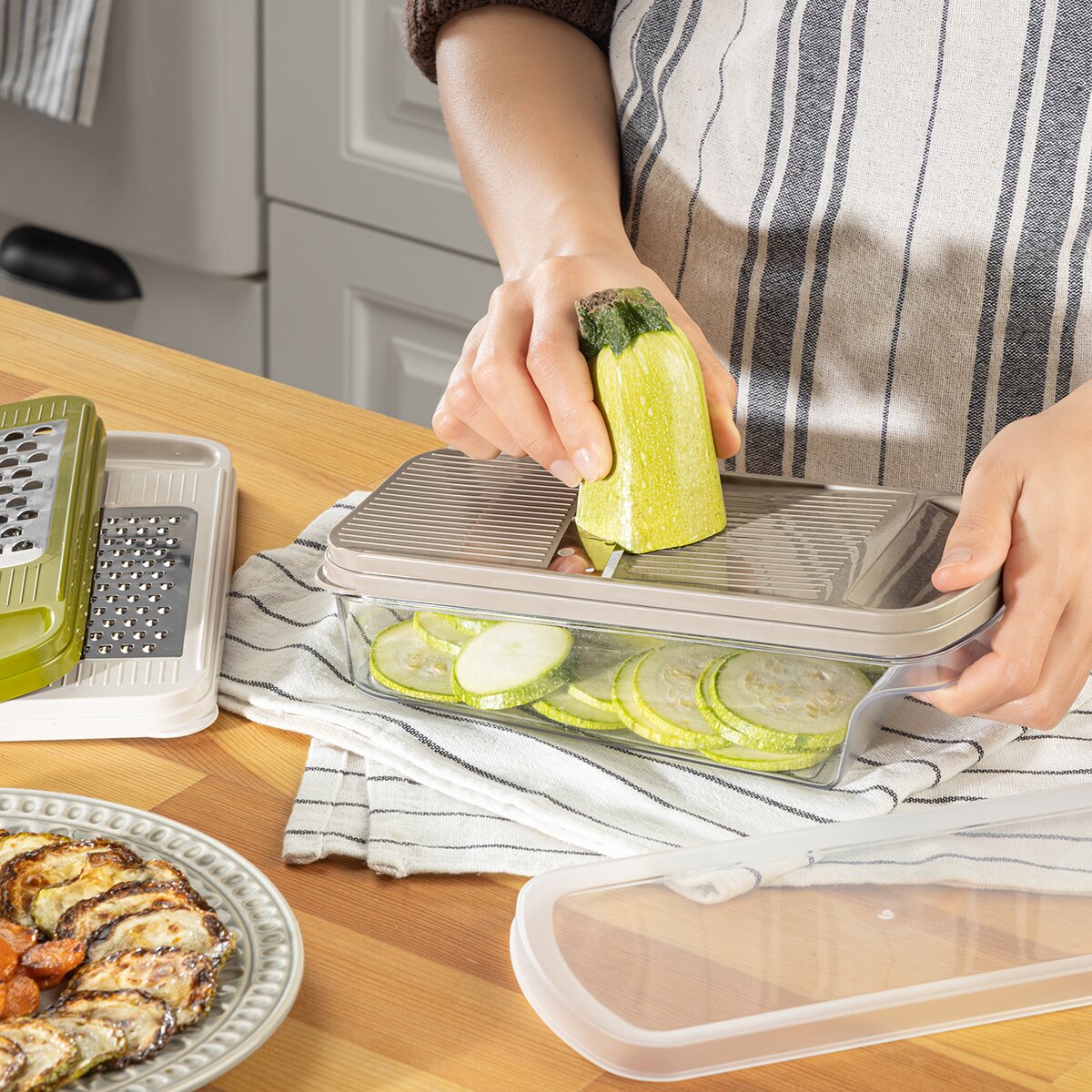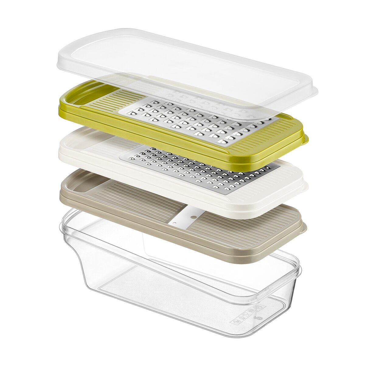 Kód produktu 144813Strúhadlo so zásobníkom je praktickým pomocníkom do každej kuchyne, ktorý uľahčuje prípravu potravín. Disponuje veľkou strúhacou plochou, vďaka ktorej je práca rýchla a efektívna. Súčasťou sú tri vymeniteľné nástavce umožňujúce rôzne druhy strúhania i krájania na plátky, takže ho možno využiť na širokú škálu surovín. Nastrúhané potraviny sa zhromažďujú priamo v zásobníku, ktorý je možné jednoducho uzavrieť vekom a uložiť napríklad do chladničky bez toho, aby bolo nutné obsah presypávať. Ergonomické a ľahké uchytenie zaisťuje pohodlnú a bezpečnú manipuláciu počas krájania, čo oceníte pri každodennom používaní. Výrobok je BPA-free. Materiál: plast PPR (viečko) + plast PS (zásobník) + plast ABS (nástavce) + nerezová oceľ. Rozmery: 24x11x10 cm. Možno umývať v umývačke.