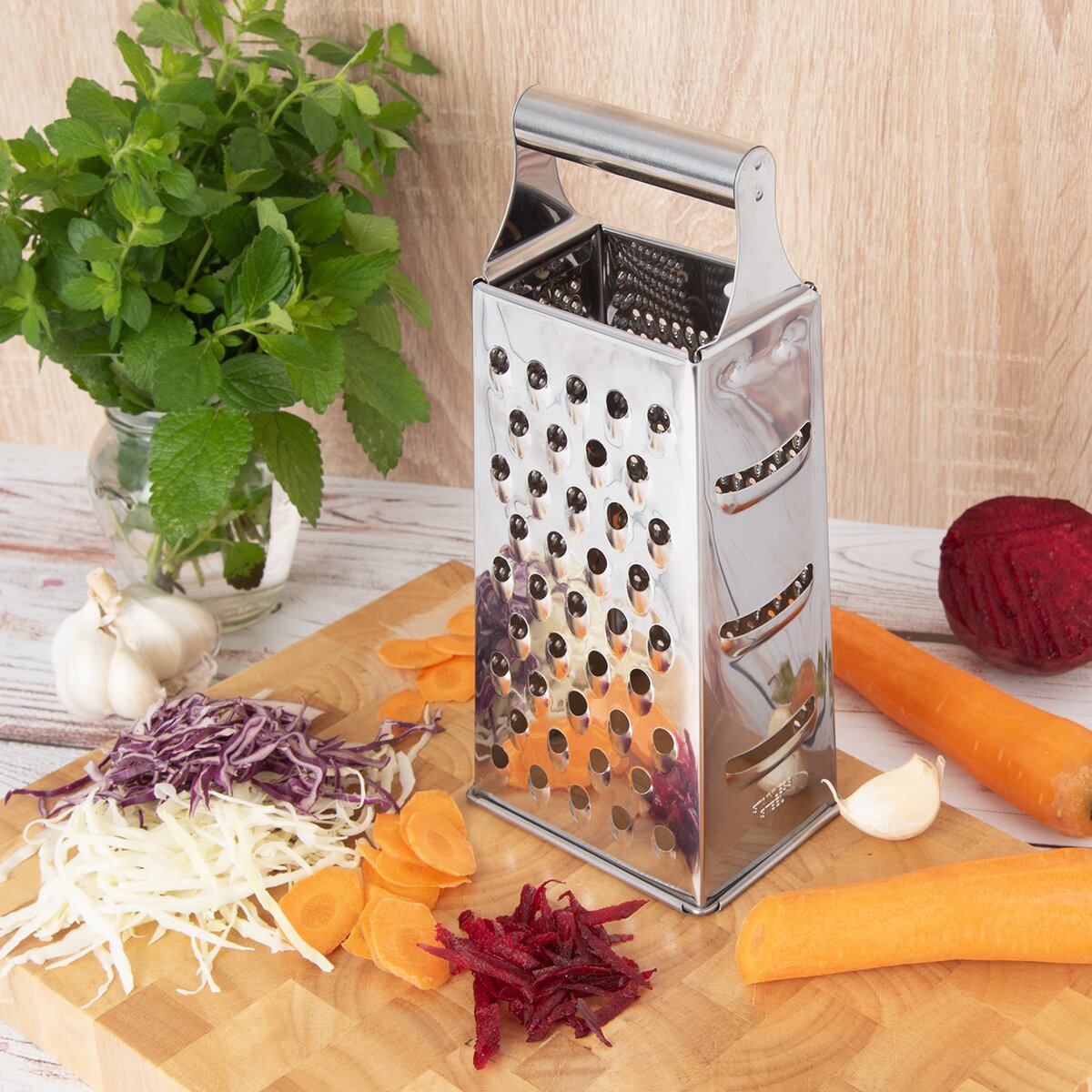 Klasické štvorhranné strúhadlo s rôznymi typmi strúhacích plôch pre ručné strúhanie ovocia, zeleniny i syrov. Či už chcete strúhať vybrané ovocie, zeleninu, zemiaky na zemiakové placky, cesto na zátrepku do polievky alebo syry na zapečenie, stačí strúhadlo pevne chytiť za držadlo v hornej časti, aby sa vám pri strúhaní pohodlne držalo, a môžete začať.