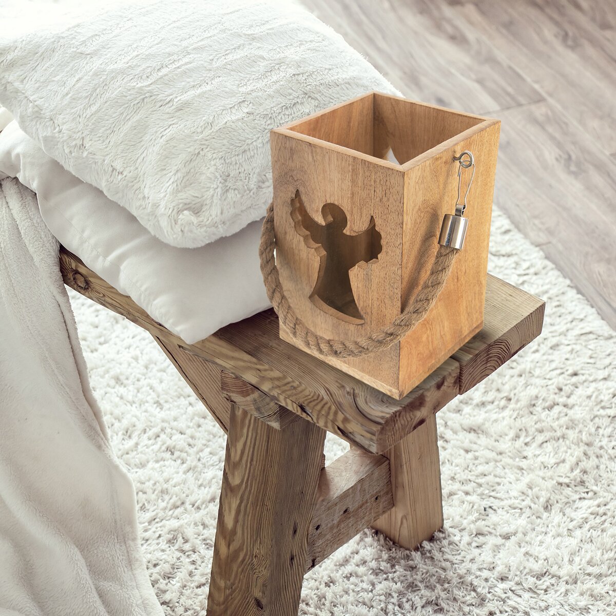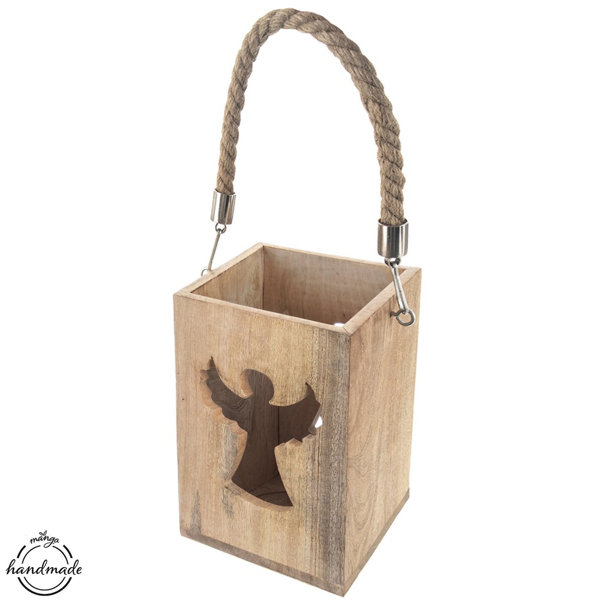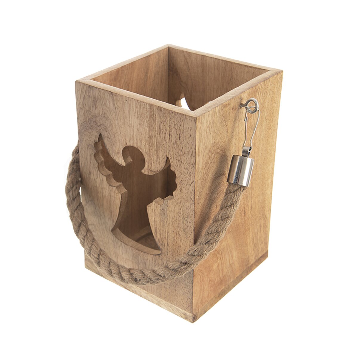 Viac informáciíKrásny svietnik z mangového dreva je doplnený silným jutovým povrazom vhodným na zavesenie. Do vnútri je možné umiestniť sviečku alebo led osvetlenie, svetlo z neho preniká vyfrézovaným otvorom v tvare anjela. Tento okúzľujúci lampáš bude krásnym prvkom v interiéri, ale urobí veľkú parádu aj na terase, kde umocní oddych s pohárom vína alebo šálkou kávy v podvečerných hodinách.