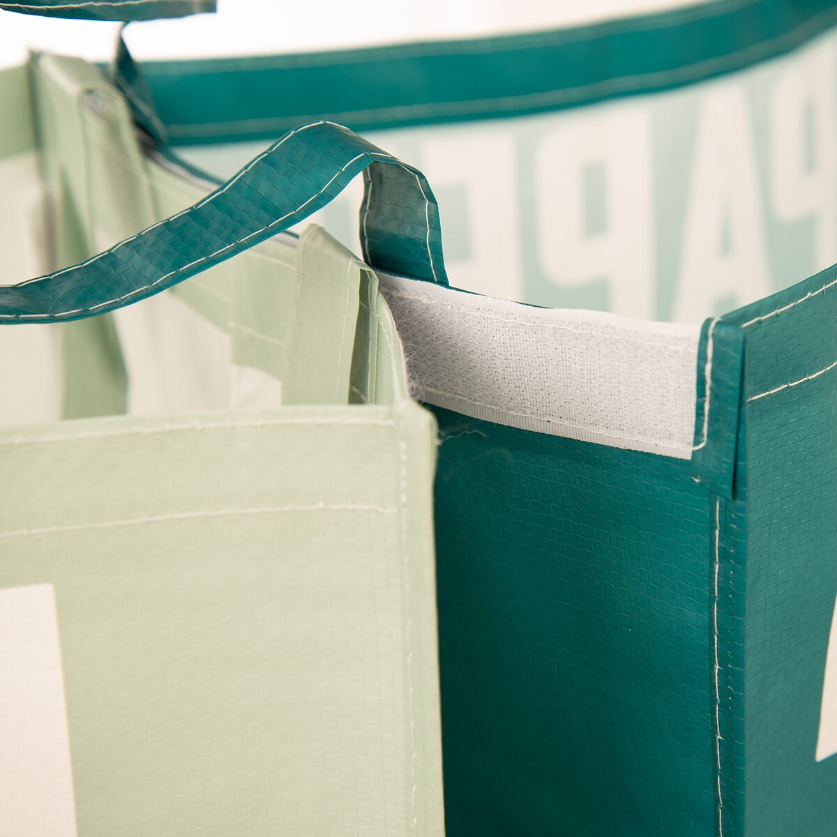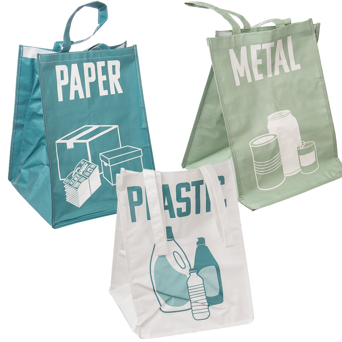 Sada 3 tašiek na triedený odpad (plast, papier, kov). Farebne odlišné, s potlačou. Je možné ich spojiť k sebe pomocou suchého zipsu – lepšia stabilita. Opatrené uchami pre ľahké vynášanie do kontajnerov. Materiál: plast, papier. Rozmery: jedna taška 30x30x39 cm.