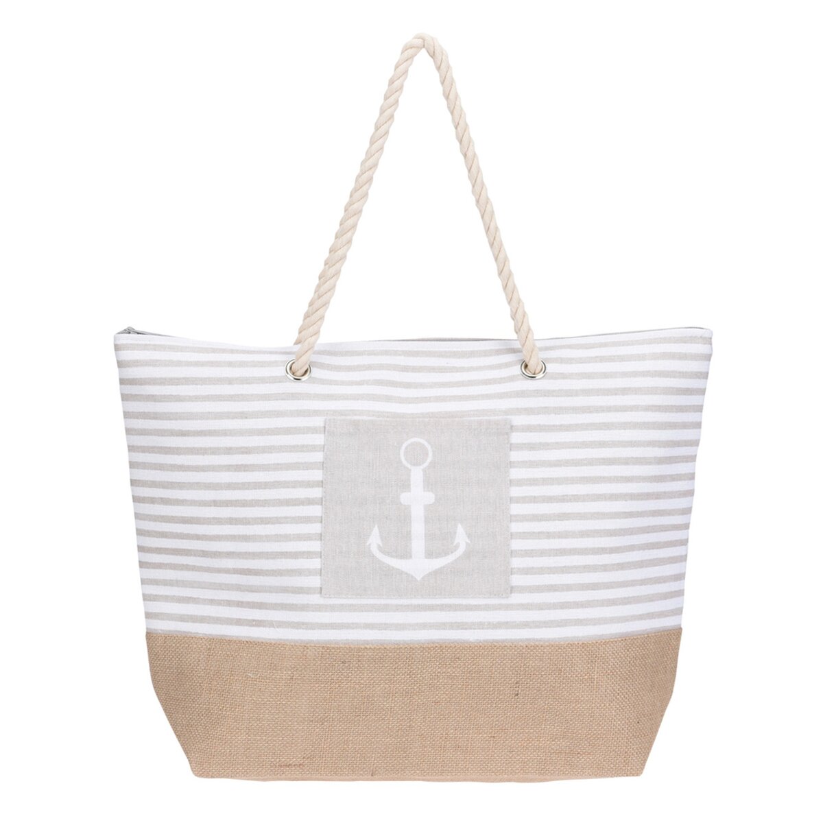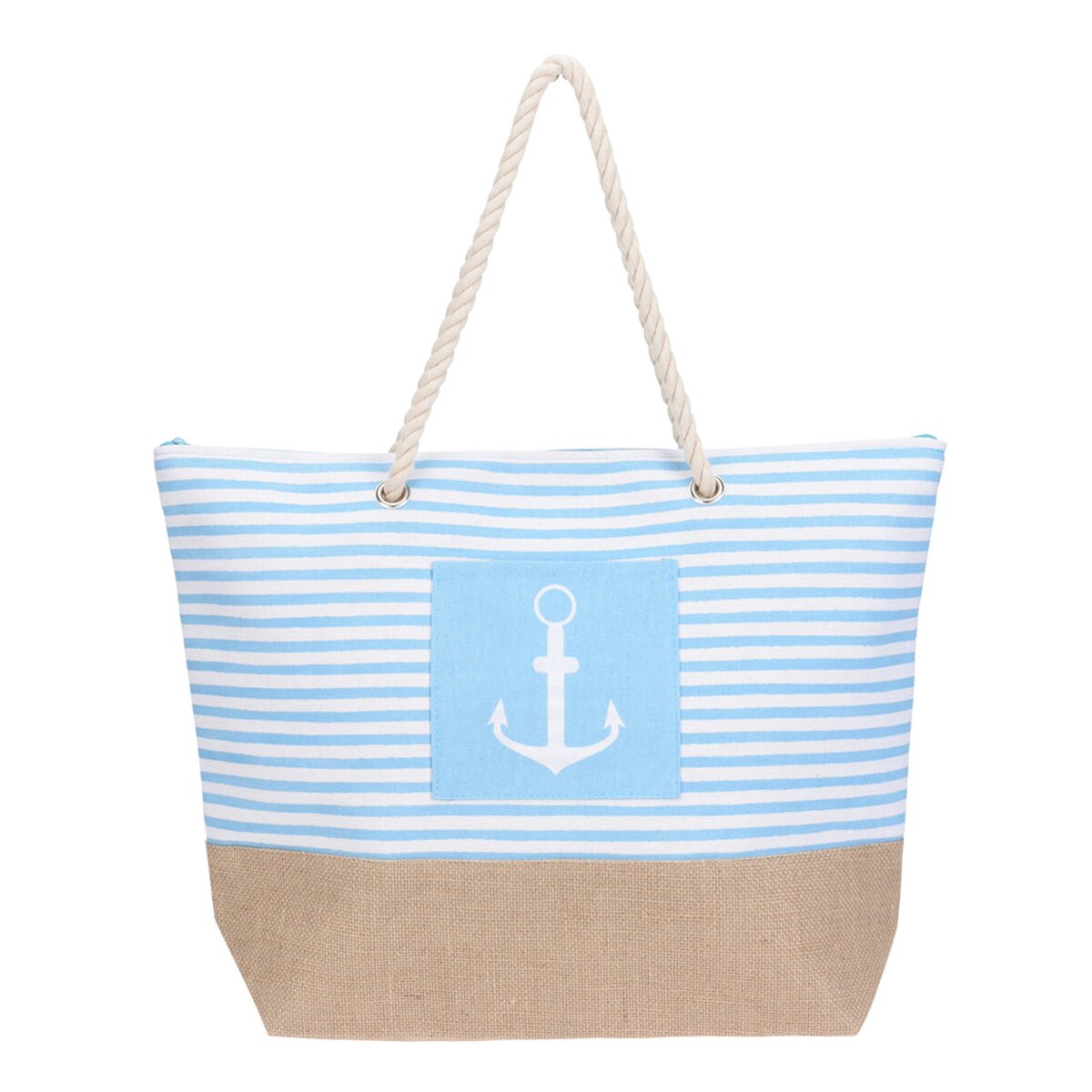 Kód produktu 731415Plážová taška z juty, bavlny a polyesteru v námorníckom štýle, s dvoma ušami a vnútorným a vonkajším vreckom, ktorá sa hodí nielen k vode, ale aj na nákup v obchode alebo na trhu.
