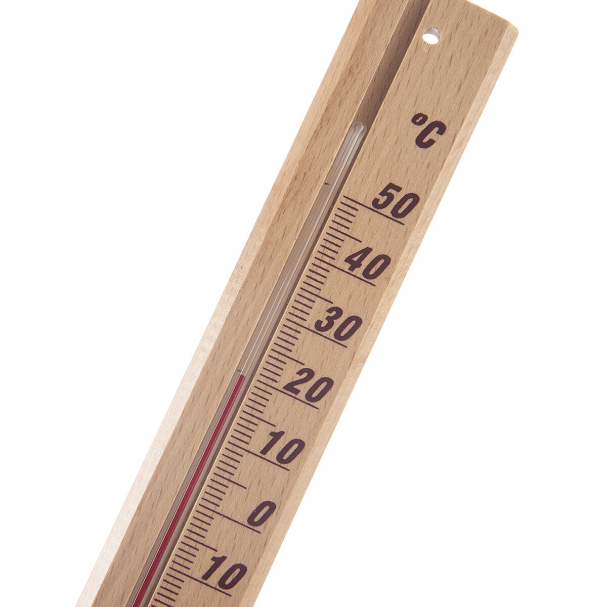 Tento nástenný drevený teplomer sa hodí na meranie teploty ako vo vnútorných, tak aj krytých vonkajších priestoroch. Má otvor na zavesenie a obsahuje petrolejovú náplň.