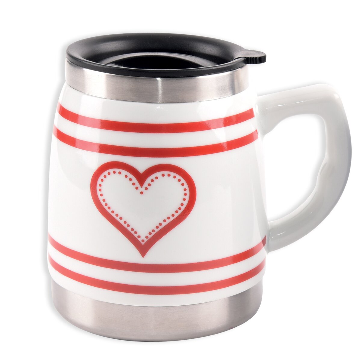 Hrnček termo udrží Váš nápoj dlhšiu dobu teplý alebo naopak chladný. Je praktický pre šoférov na cesty, ale aj na bežné pitie kávy, čaju. Plastové viečko so silikónovým tesnením, uzatvárateľný otvor na pitie. Materiál: nerez, keramika, plast. Dekór SRDCE. Rozmery: objem 0,5 l, pr. 10,5 cm, v. 13 cm.