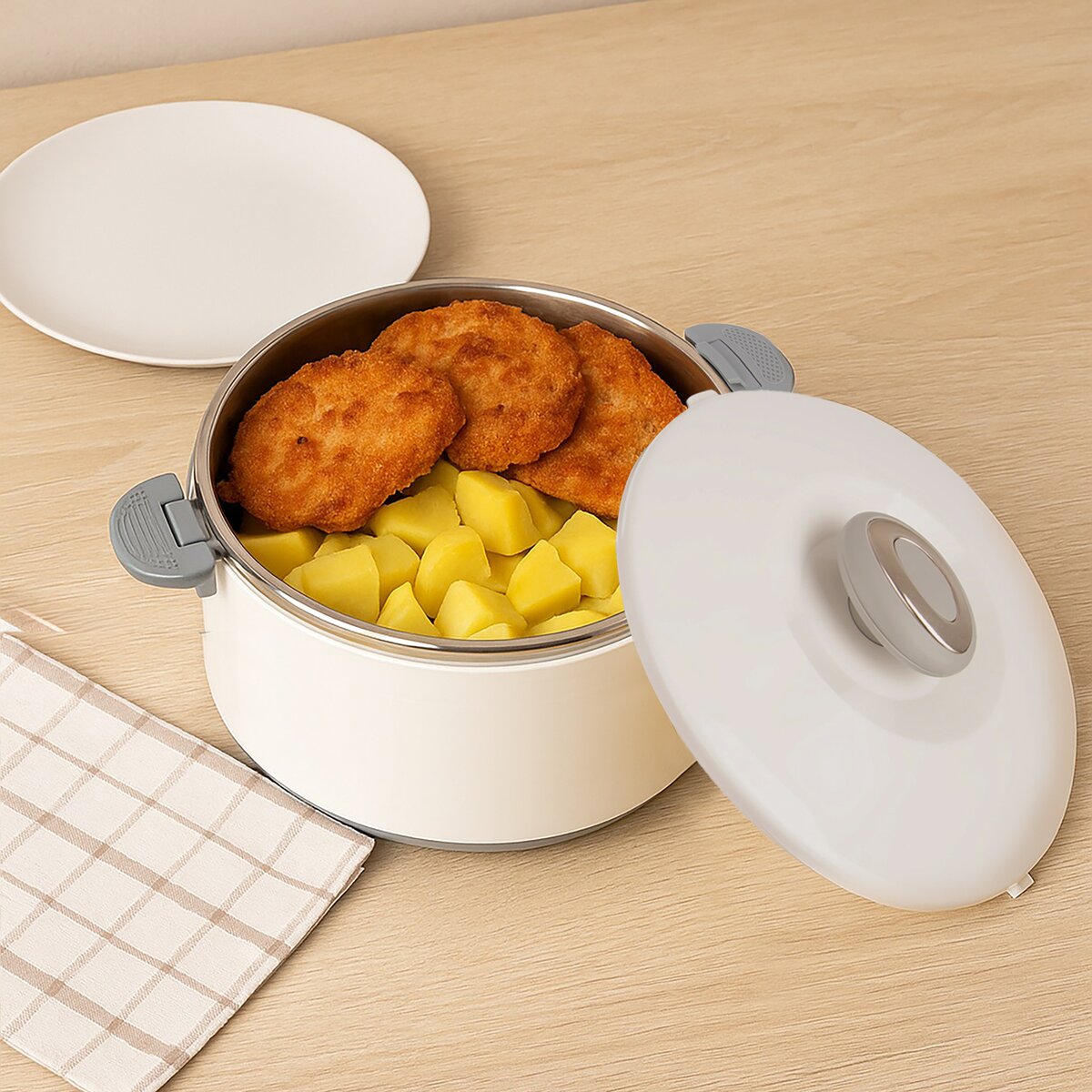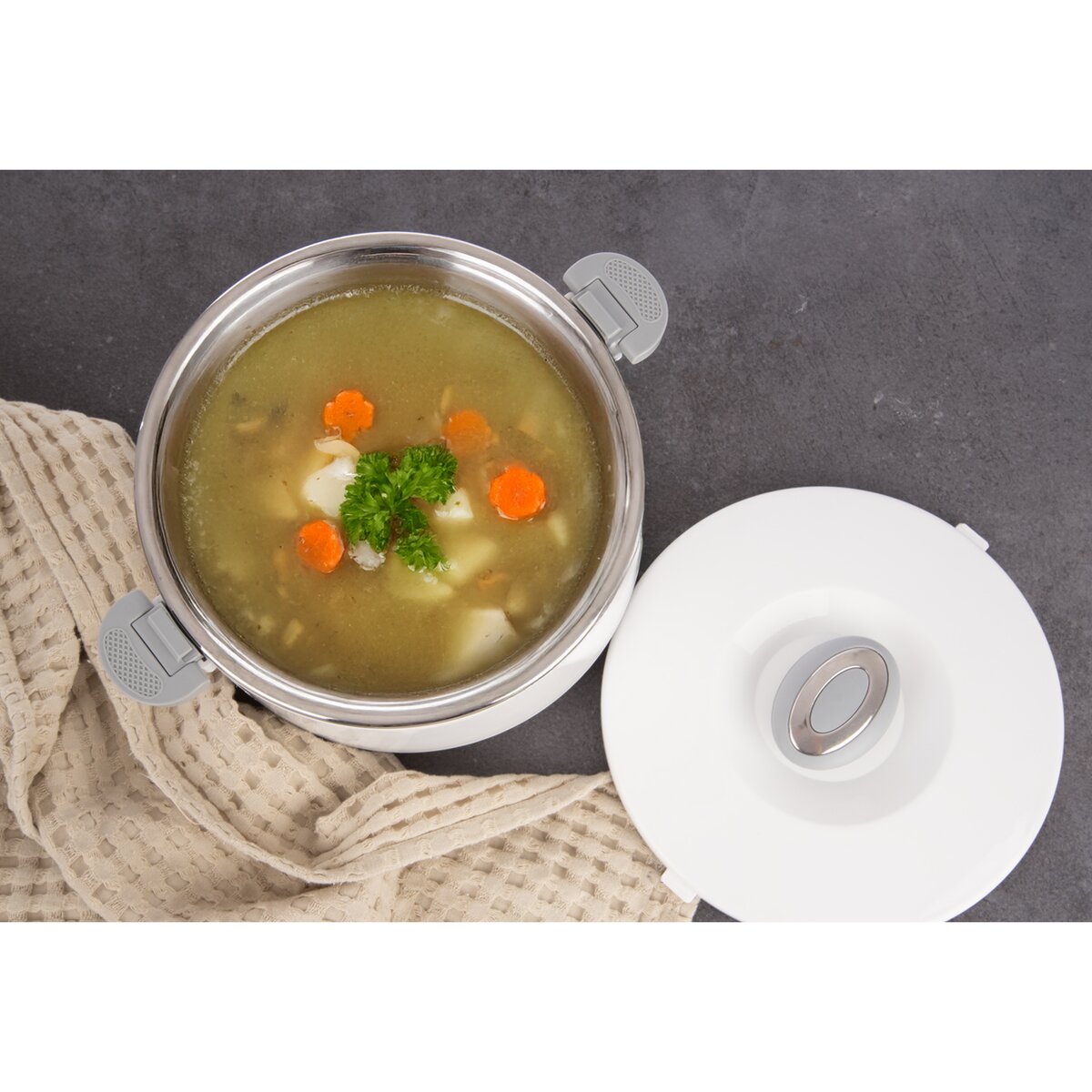 Kód produktu 128538Termomisa v plastovom obale s nerezovým vnútrom udrží vložený pokrm po dlhú dobu teplý alebo naopak studený. Ľahké uzatváranie otočením plastového termoviečka. Využijete ju v domácnosti, zamestnaní i na cestách, v lete i zime. Skvelé izolačné vlastnosti. Je ľahká, jednoducho prenosná. Hladký povrch je jednoducho umývateľný. Výborné využitie v teplých letných dňoch na zmrzlinu. Dĺžka udržania teploty v nádobe závisí od okolitej teploty, resp. teplotných rozdielov vonkajšej teploty a teploty vo vnútri nádoby. Pred vložením studeného pokrmu, napr. zmrzliny, vložte nádobu cca na hodinu do chladničky, predĺžite tým chladiaci efekt. Pri vkladaní teplého jedla nalejte do vnútra horúcu vodu, ktorú zhruba po 1-2 minútach vylejte. Materiál: nerezová oceľ, plast. Rozmery: pr. 24,5 cm, v. 17 cm, š. s ušami 32,5 cm, úžitkový objem 4 l, celkový objem 4,7 l. Nie je vhodná do umývačky riadu ani mikrovlnnej rúry.