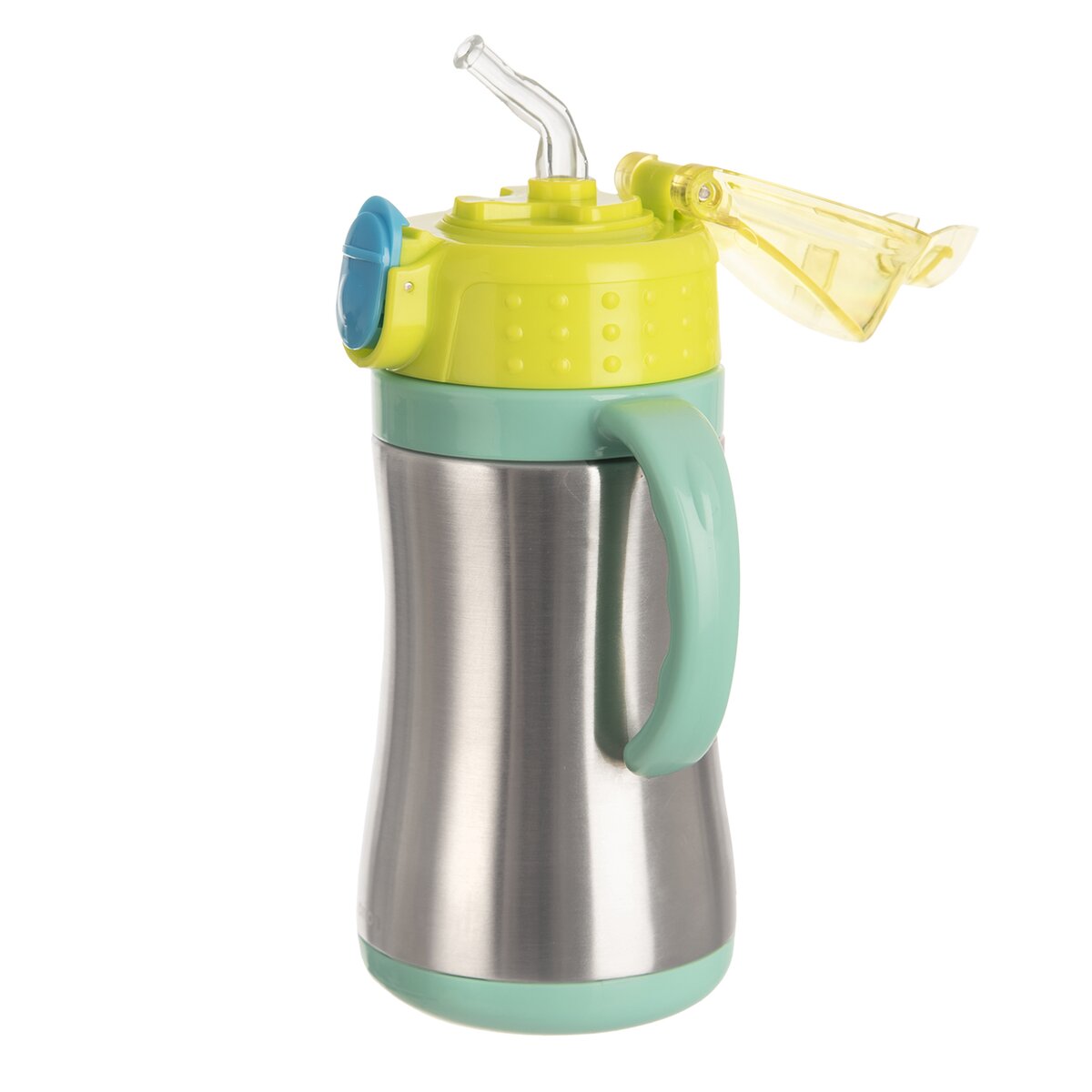 Kód produktu 128517Nerezová dvojstenná termoska s objemom 330 ml udrží nápoje dlho studené alebo teplé. Má transparentné zelené výklopné viečko, silikónové tesnenie a pružnú slamku, čo príde vhod na ihrisku aj výlete. Ľahko sa drží vďaka dvom modrozeleným rukovätiam.