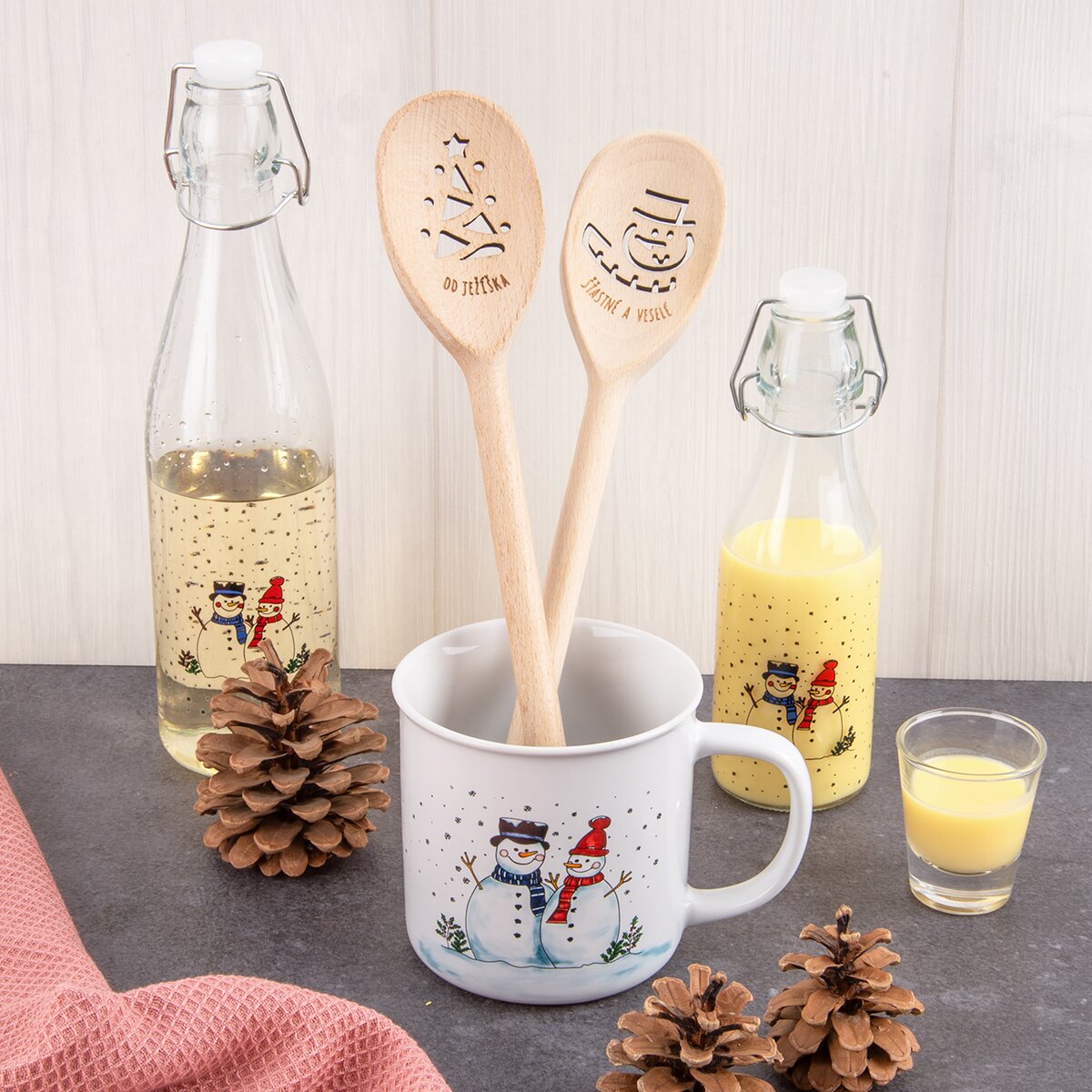 Táto buková vareška je zdobená textom "ŠŤASTNÉ A VESELÉ", nad ktorým je vypaľovaný motív snehuliaka. Ten vznikol v dielni našich dizajnérov.