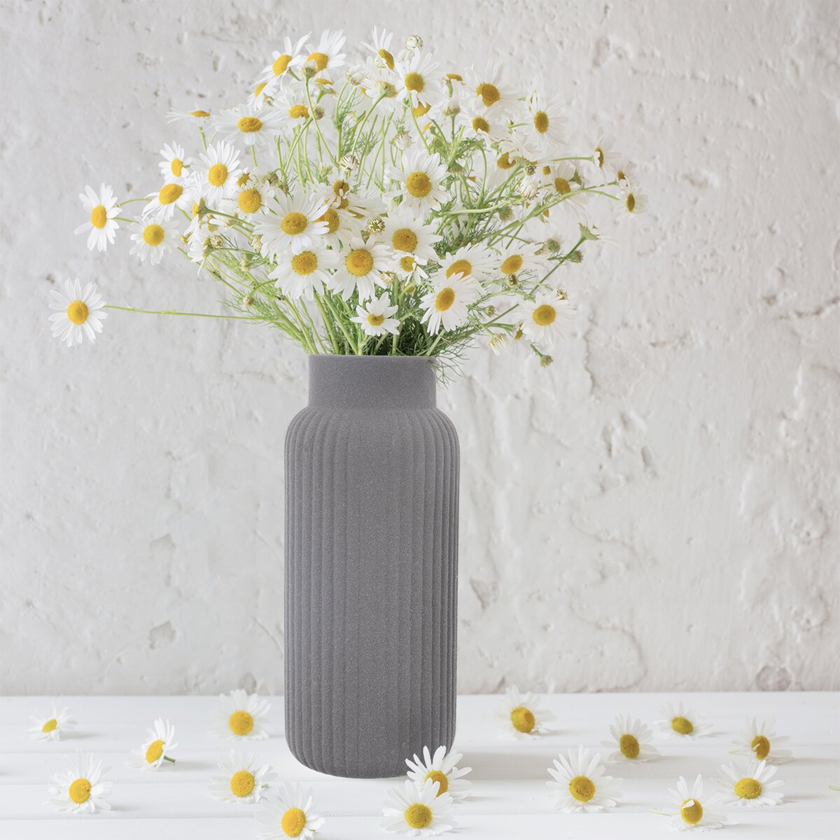 Štýlová porcelánová váza s hrubou povrchovou štruktúrou a pozdĺžnym rebrovaním bude ozdobou stola, okenného parapetu aj komody. Krásnu dekoráciu a dotyk prírody v interiéri vykúzlite lúčnymi kvetinami, modernou väzbou z frézií, eukalyptu a hortenzií aj sušenými kvetmi.