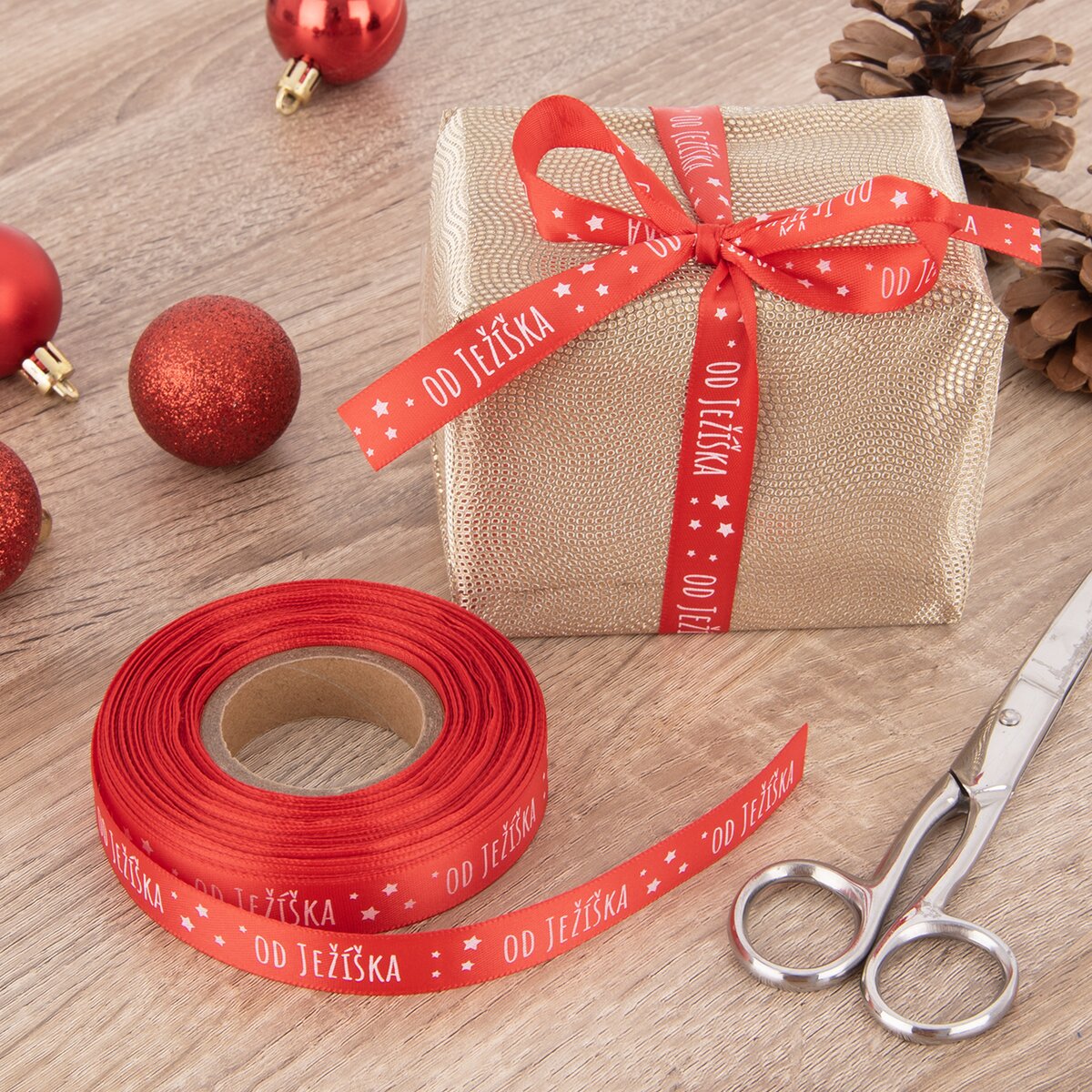 Kód produktu 823107Červená stuha s potlačou "OD JEŽÍŠKA" je určená na originálne balenie vianočných darčekov alebo na doplnenie najrôznejších vianočných dekorácií. Má dĺžku 25 m.