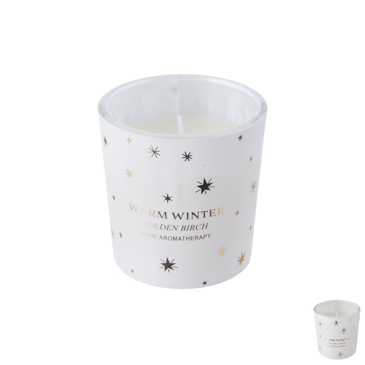 Sviečka z vosku má bavlnený knôt a je vsadená do skleneného obalu, zdobeného dekorom snehových vločiek.