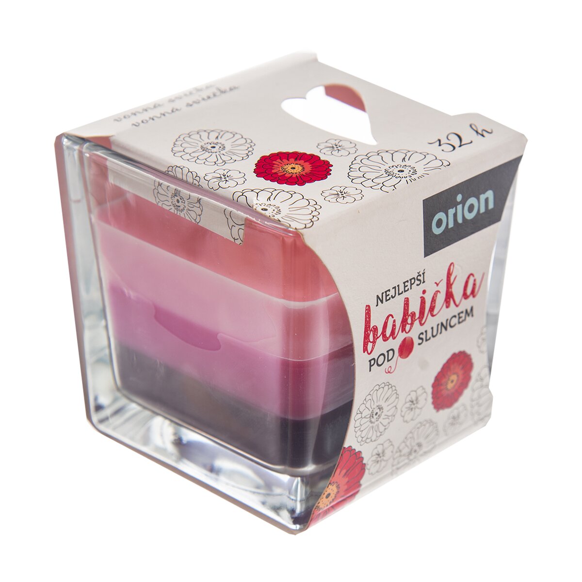 Kód produktu 822240Trojfarebná aróma sviečka NEJLEPŠÍ BABIČKA POD SLUNCEM s ovocnou vôňou a s dĺžkou horenia cca 32 hodín.