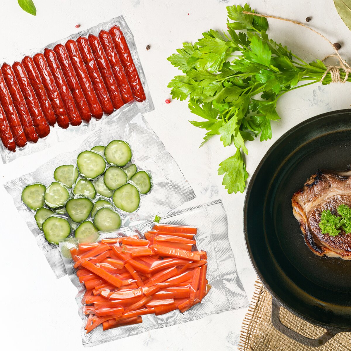Skúste pred grilovačkou naložiť mäso do marinády a zavákuovať, skrátite a zefektívnite čas marinovania a mäsko bude pekne preležané, plné chuti byliniek a korenia. Ideálne sú aj pre suché potraviny, údeniny, syry atď.