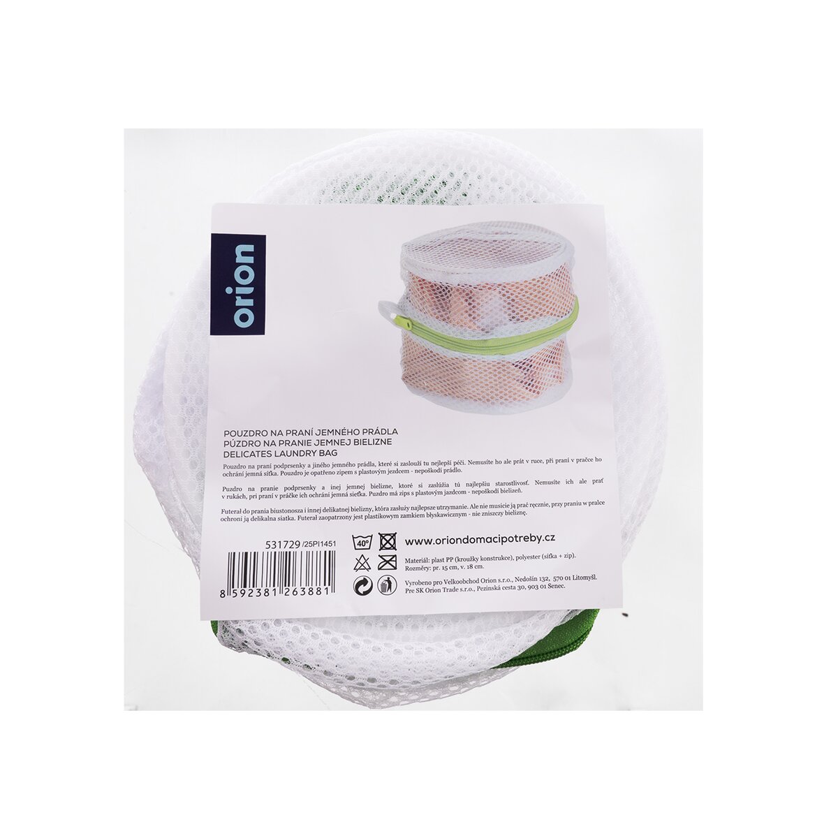 Kód produktu 531729Puzdro na pranie podprsenky a inej jemnej bielizne, ktoré si zaslúžia tú najlepšiu starostlivosť. Nemusíte ich ale prať v rukách, pri praní v práčke ich ochráni jemná sieťka. Puzdro má zips s plastovým jazdcom - nepoškodí bielizeň. Materiál: Plast PP (krúžky konštrukcie), polyester (sieťka + zips). Univerzálna veľkosť. Rozmery: pr. 15 cm, v. 18 cm.