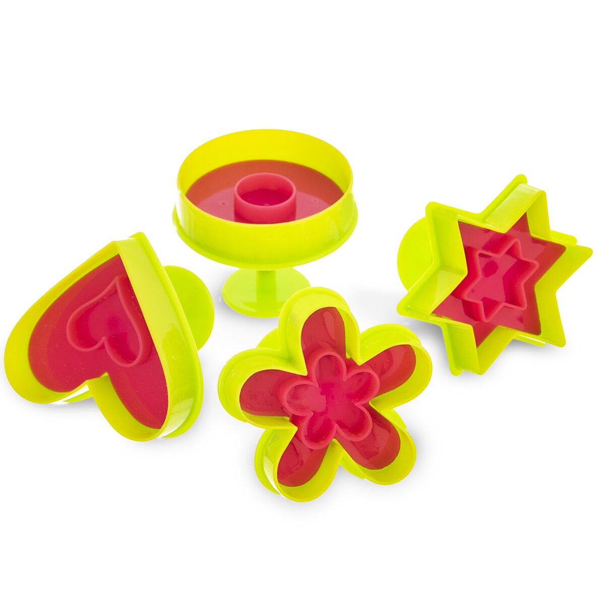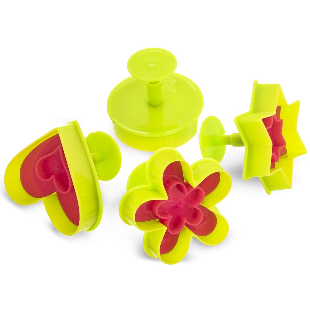 Vykrajovačky na marcipán Vám pomôžu vytvoriť krásne plastické tvary na zdobenie torty, zákuskov, na vytvorenie čajového pečiva aj vianočného pečiva... Vykrojíte požadovaný tvar z marcipánu či cesta, vytlačíte ho z formičky a môžete ho ďalej tvarovať. Materiál: plast. Ľahká údržba - dá sa umývať v umývačke na riad. Súprava 4 tvarov - srdce, hviezda, kvetinka a koliesko. Rozmery: pr. cca 6,5 cm.