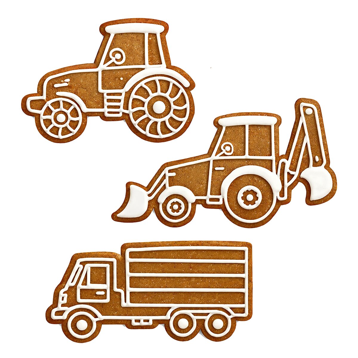 Kód produktu 132628Sada vykrajovačiek vám umožní vytvoriť si doma voňavé perníčky. Sada obsahuje 3 tvary: traktor, bager a nákladné auto. Súčasťou balenia je recept. Materiál: nehrdzavejúca oceľ. Rozmery: 6,2x4,8x1,5 cm, 9,2x4,7x1,5 cm a 7,8x3,7x1,5 cm. Vhodné do umývačky riadu.