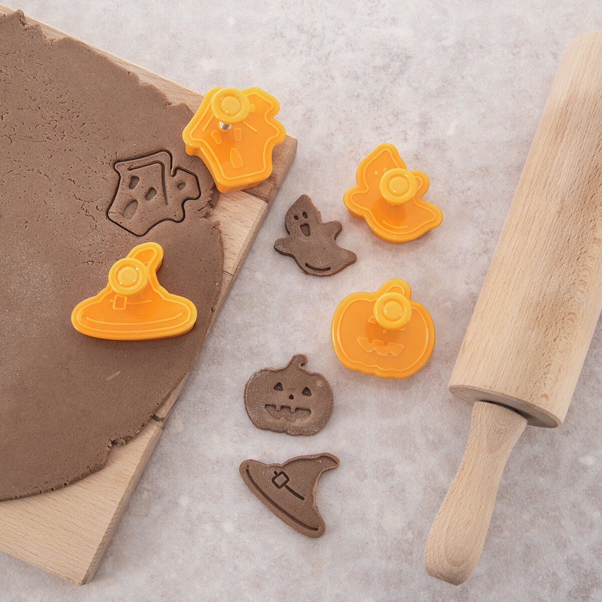 Viac informáciíSušienky s pekným halloweenskym reliéfom v tvare ducha, tekvice, strašidelného domčeka a klobúka vytvoríte ľahko a rýchlo. Na to dobre poslúžia vykrajovačky z PP plastu, ktoré vtlačením do vyvaľkaného cesta vykroja obrys a zatlačením na piest s oceľovou pružinou sa reliéf obtlačí do plochy. Tieto pečiatky ocenia veľkí aj malí pomocníci pri pečení sušienok a strašidelných perníčkov.