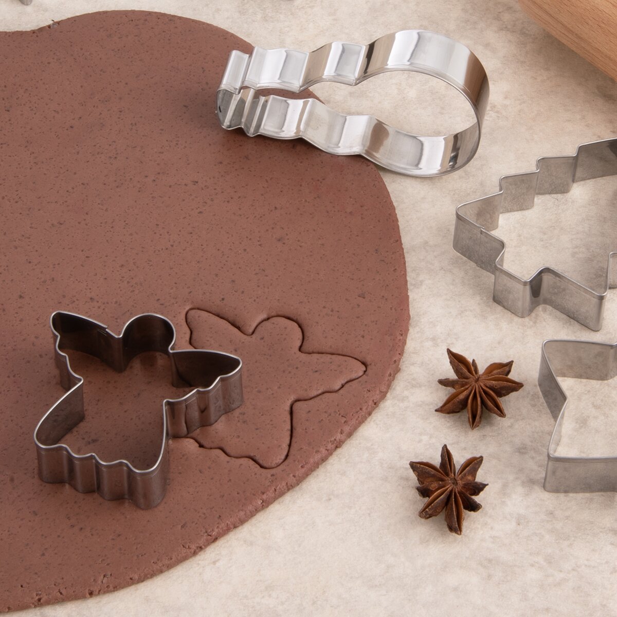 Rozmery vykrajovačiek: snehuliak 5,2x9,5x2 cm, vločka pr. 7 cm, v. 2 cm, anjel 6,5x6x2 cm, zvonček 8x7x2 cm, hviezda pr. 7 cm, v. 2 cm a stromček 6x7,5x2 cm