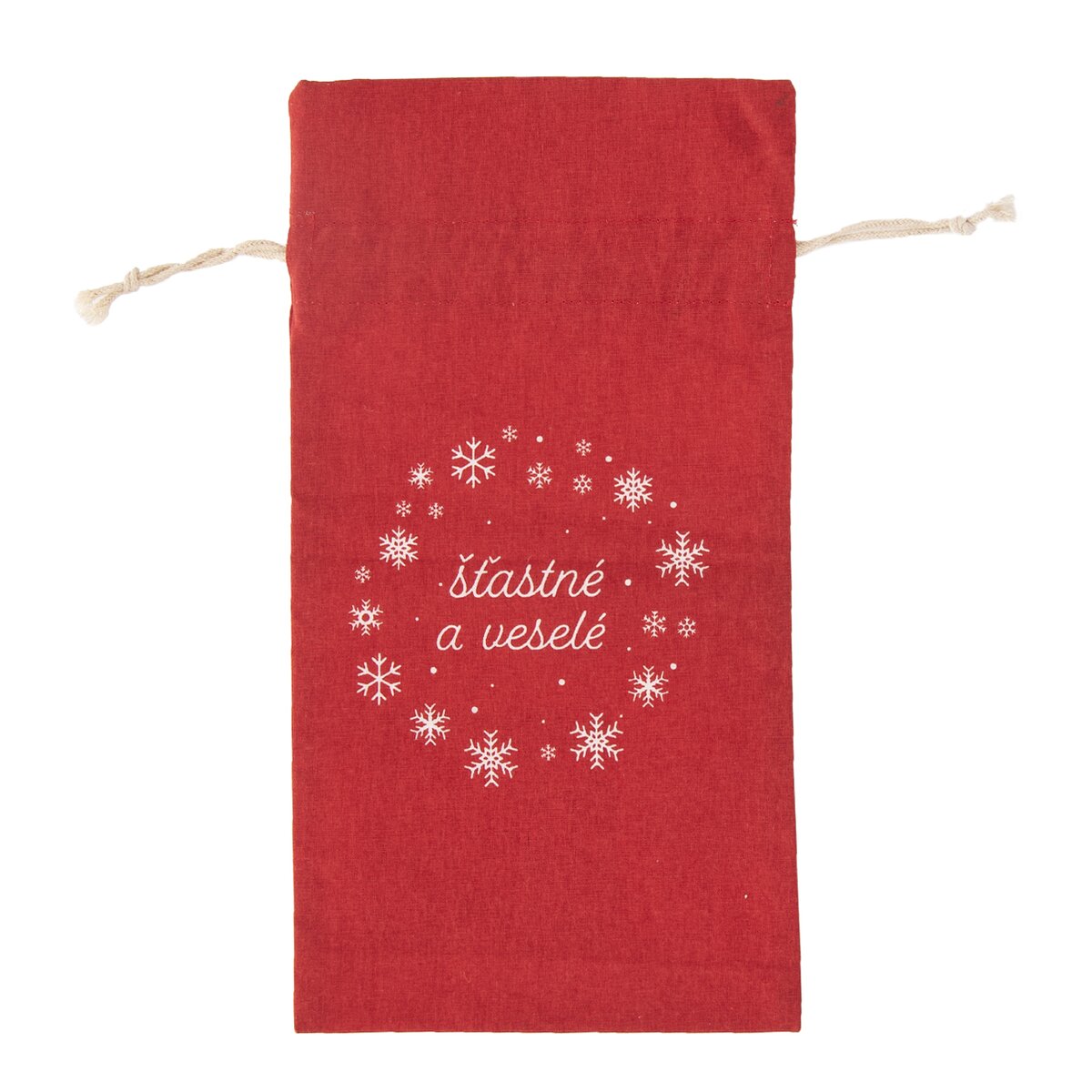 Látkové červené vrecko s dekorom vločiek a nápisom ŠŤASTNÉ A VESELÉ je určené na uloženie fľaše vína alebo iného obľúbeného alkoholu, ale aj na ďalšie drobnosti alebo tzv. mäkké darčeky, ktoré sa zle balia do baliaceho papiera. A na rozdiel od papiera ho možno používať opakovane.