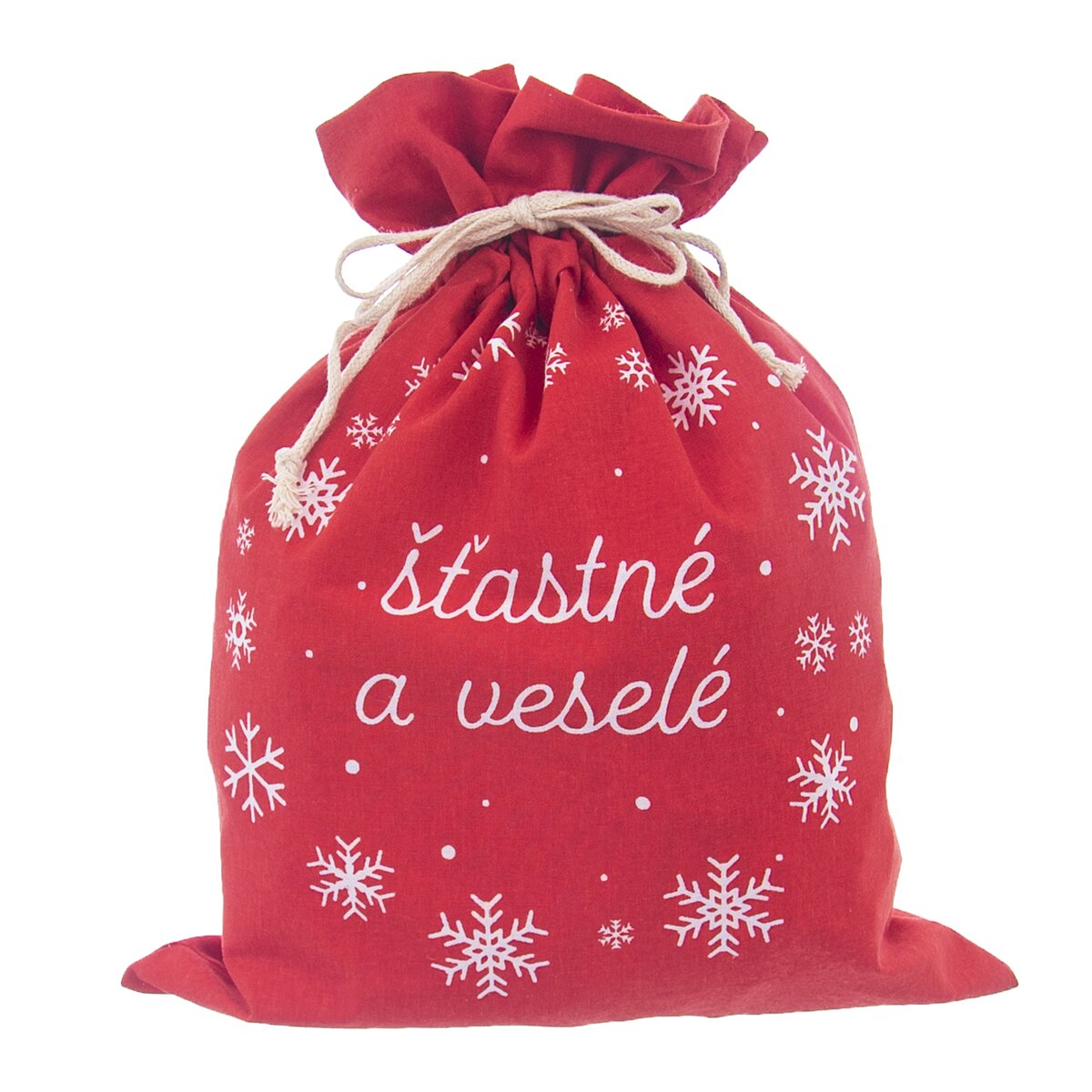 Väčšie červené látkové vrecko s dekorom vločiek a nápisom ŠŤASTNÉ A VESELÉ je určené na uloženie darčekov, napr. originálnych hrnčekov, sviečok, kozmetiky alebo na tzv. mäkké darčeky, ktoré sa zle balia do baliaceho papiera. A na rozdiel od papiera ho možno používať opakovane.