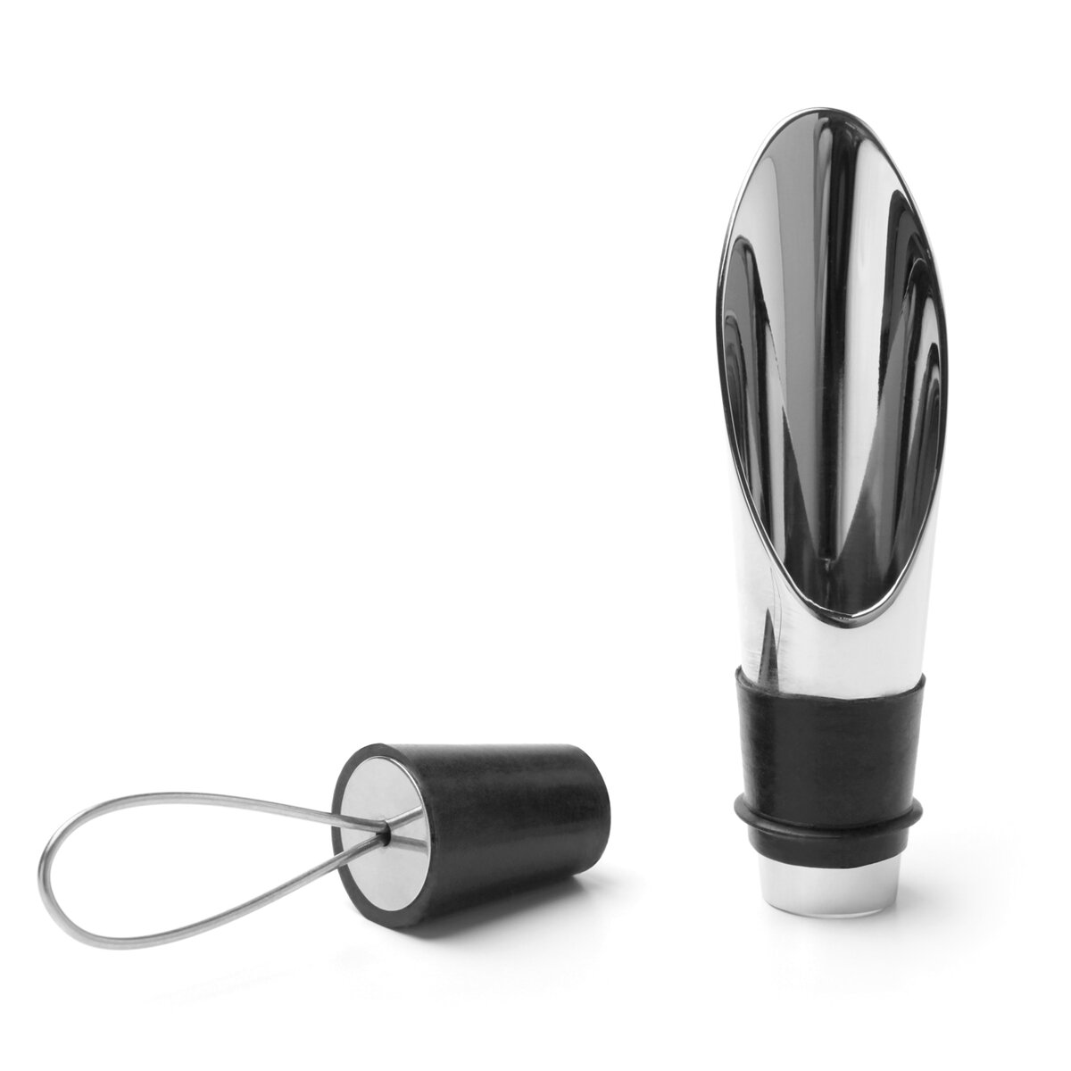 Už žiadne kvapky na stole ani stekanie vína po fľaši. Štýlová dvojitá zátka z leštenej nerezovej ocele a plastu TPR, ktorá zabráni rozliatiu vína a jeho zvetraniu. Po vybratí vnútornej zátky zostane na fľaši praktický lievik, ktorí zabráni rozliatiu vína.