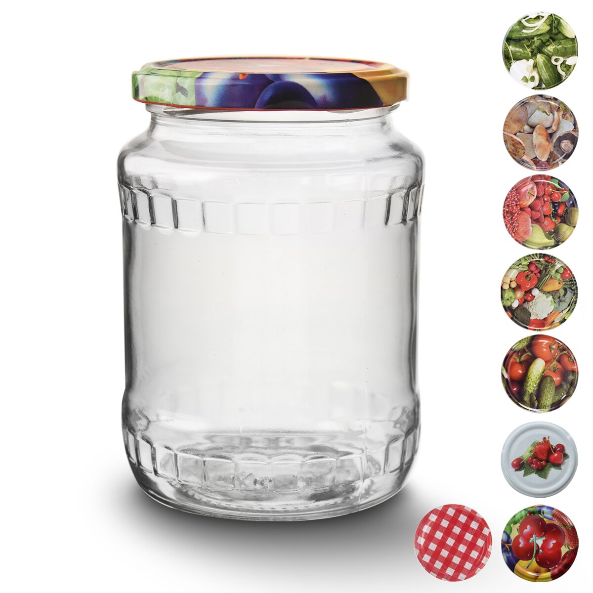 Viac informáciíVäčší zavárací pohár s objemom 0,72 l, s farebným kovovým viečkom na závit, s motívmi ovocia, zeleniny a húb.