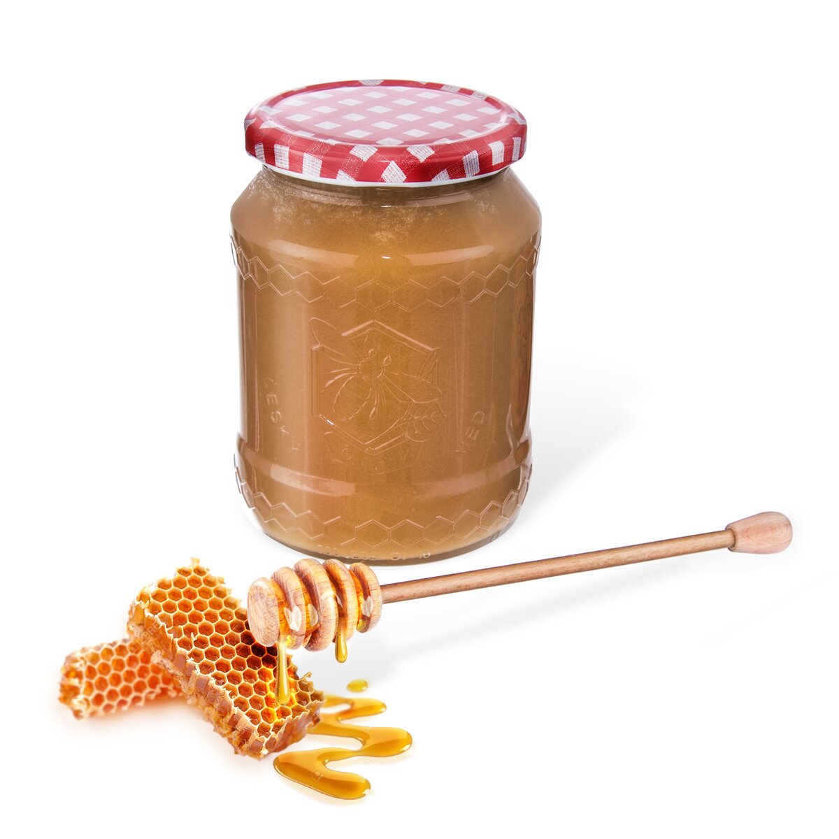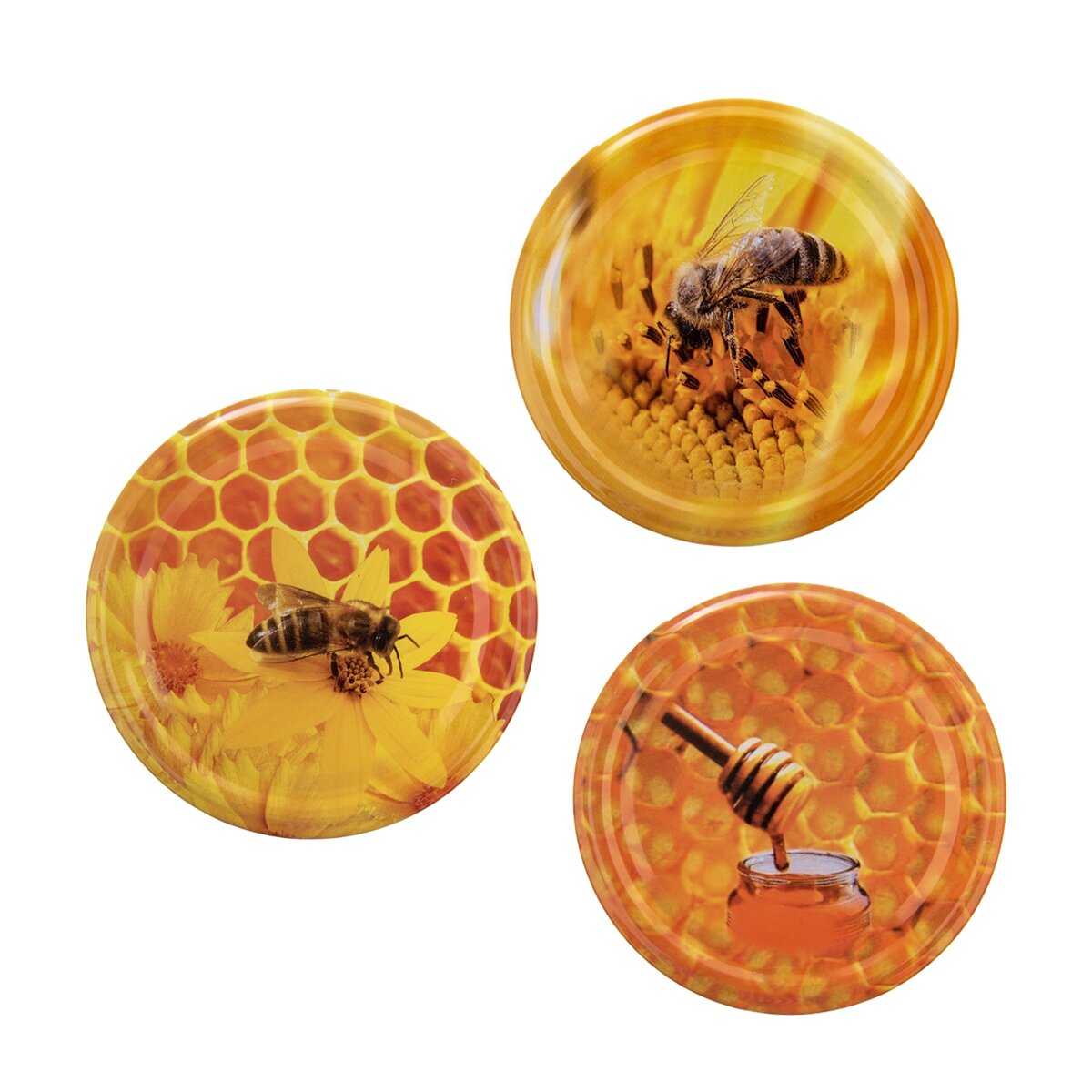 Zavárací pohár so štýlovým reliéfom pre každého vášnivého včelára, s objemom 0,73 l. S farebným kovovým viečkom na závit s motívom včielok a medových plátov.