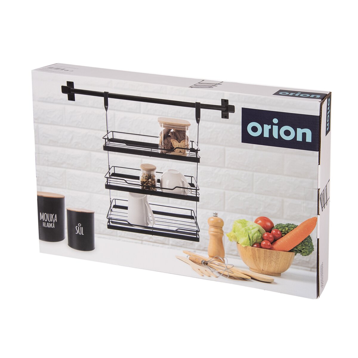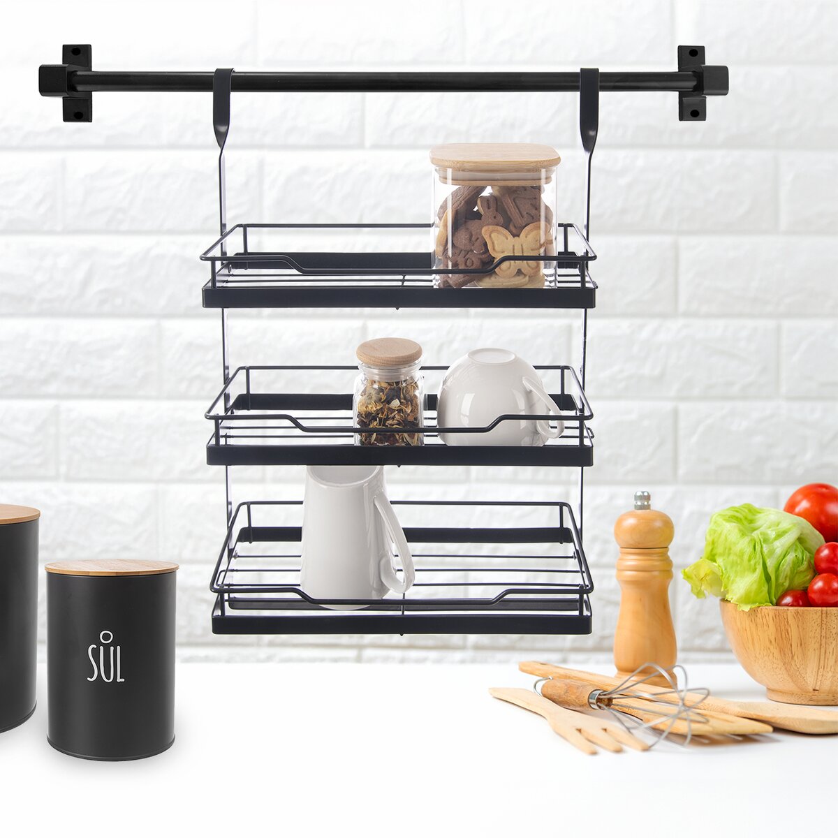 Závesnú 3poschodovú čiernu poličku umiestnite pomocou háčikov v jej hornej časti na závesný kuchynský systém alebo lištu. Môžete ju využiť na odloženie koreničiek, dochucovadiel alebo rôznych predmetov – kuchárky, zošitov s receptami, kvetináčov s bylinkami aj kávovej súpravy.