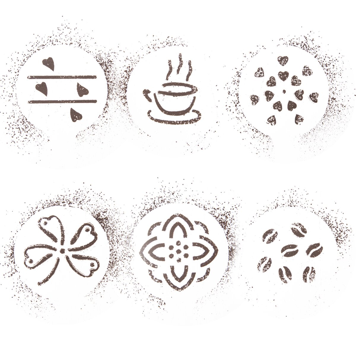 V tejto sade si možno vybrať z motívu zrniek kávy, šálky, štvorlístka, mandaly, srdiečok s linkami a kvety zo srdiečok. Ozdobíte tak jednoducho nielen lahodné cappuccino, ale aj puding, tvarohový dezert, tiramisu alebo smotanový tortu. A ak milujete štýlové servírovanie zmrzliny alebo rôznych tort, posypte dezertný tanier kakaom, práškovým cukrom či cukrárskou prachovou farbou tak, že na ňom vykúzlite pekný motív.